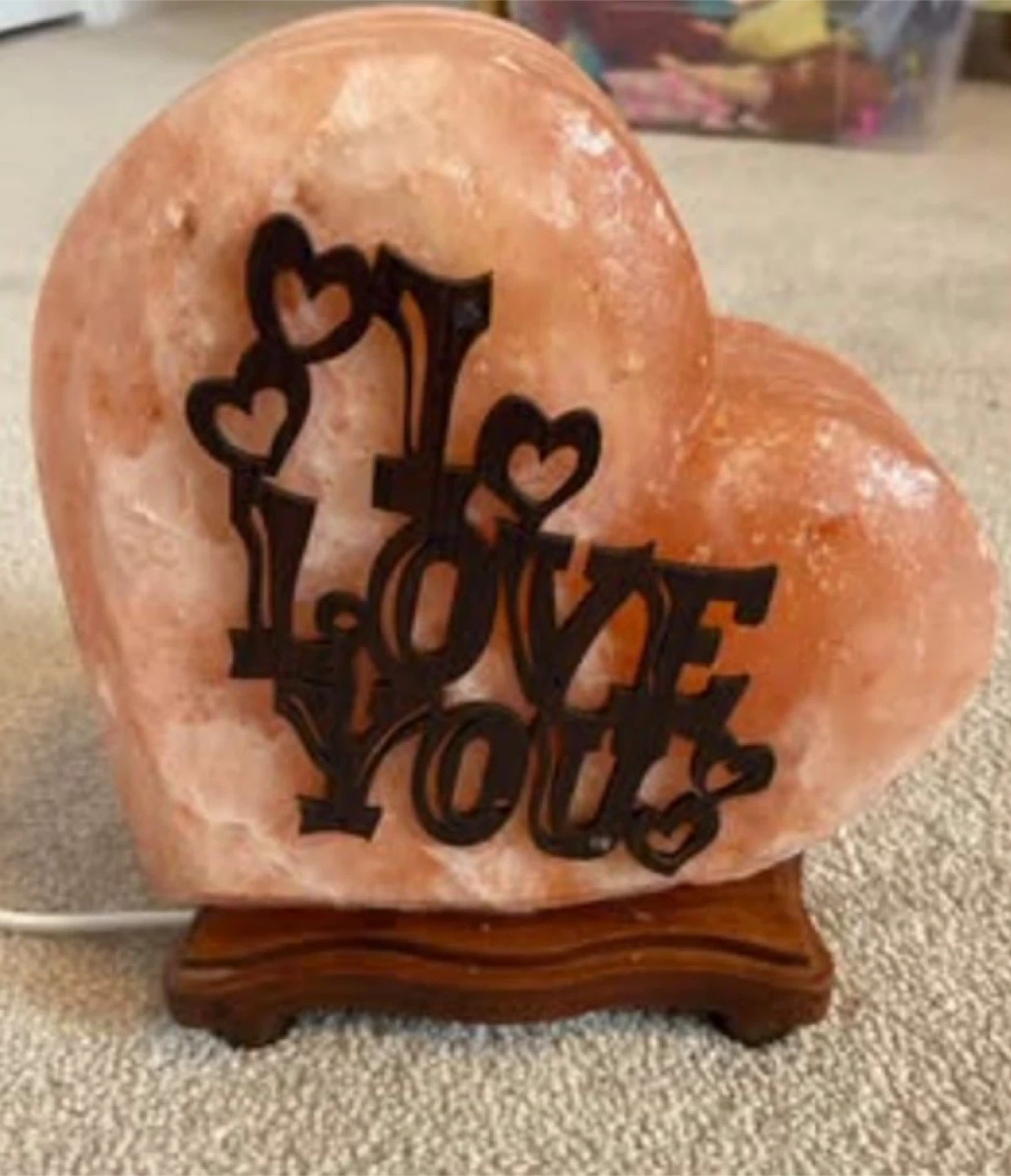 Heart shaped Himalayan salt lamp with "I LOVE YOU" text cutout. It's powered by a corded electric base. Gives off a warm, ambient glow when lit.