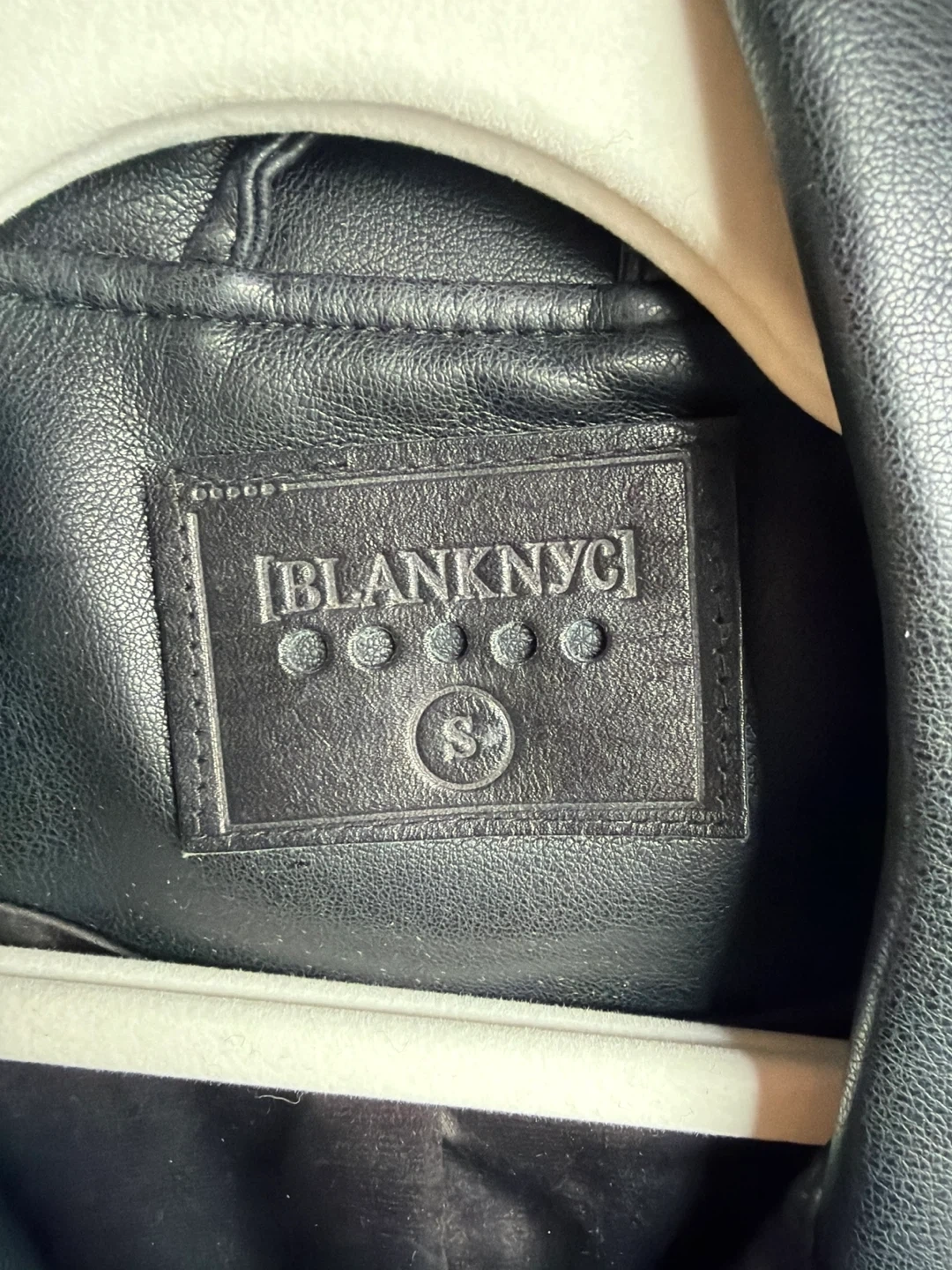 Selling a [BLANKNYC] faux leather moto jacket in black. It's a size small and in great condition! The outer shell is made of 60% polyurethane and 40% viscose, while the lining is 100% polyester