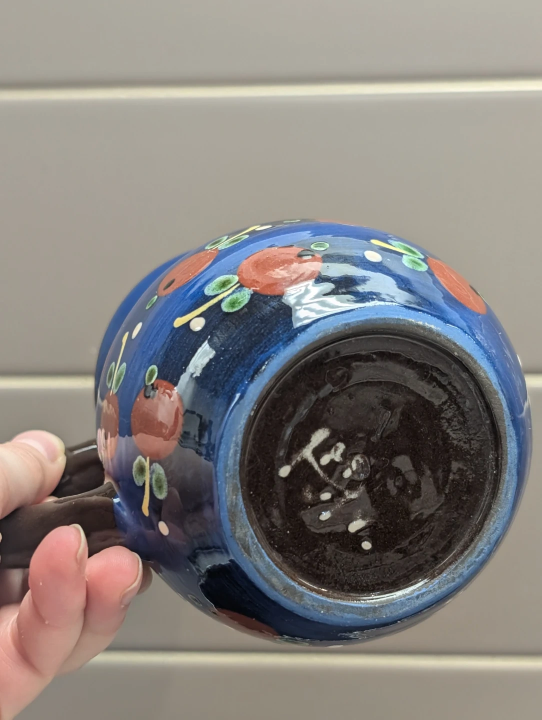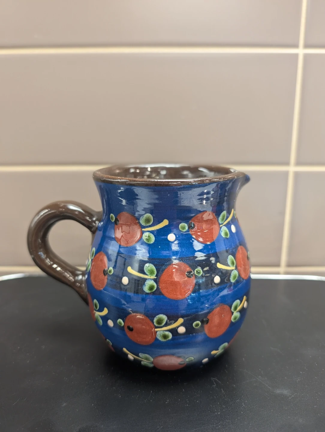 This charming ceramic pitcher is hand-painted with a delightful apple and leaf pattern on a vibrant blue background. It features a sturdy handle and a small spout for pouring. Adds a rustic touch to any kitchen decor.
