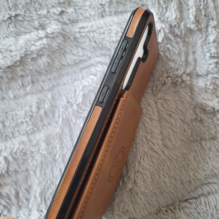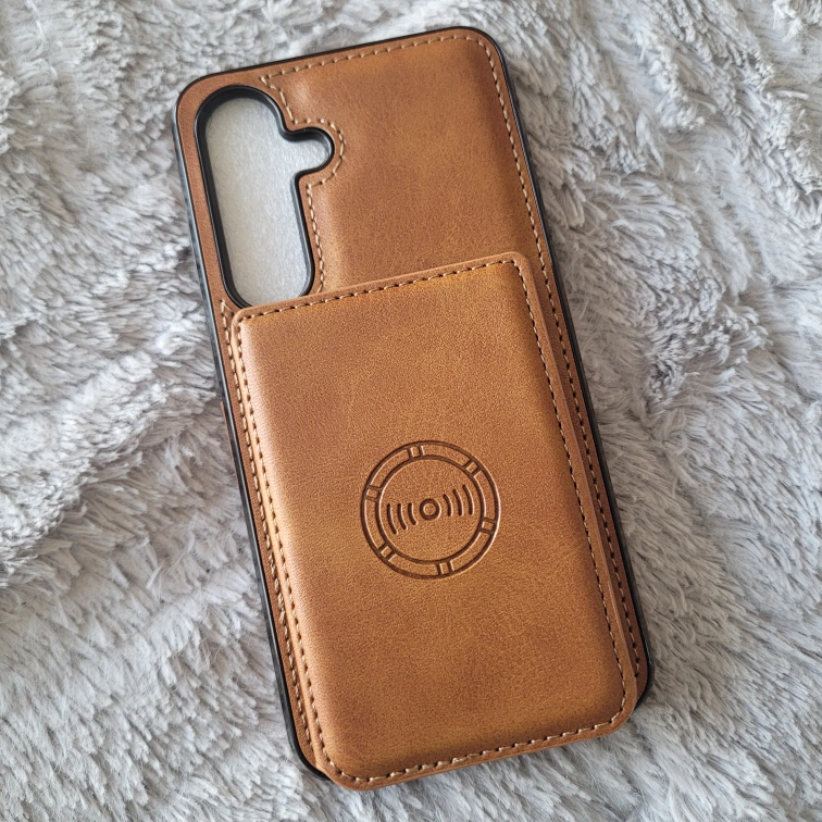 Tan brown leather phone case with wallet. Multiple card slots and a clear ID window. Protective hard case. Wireless charging compatible.