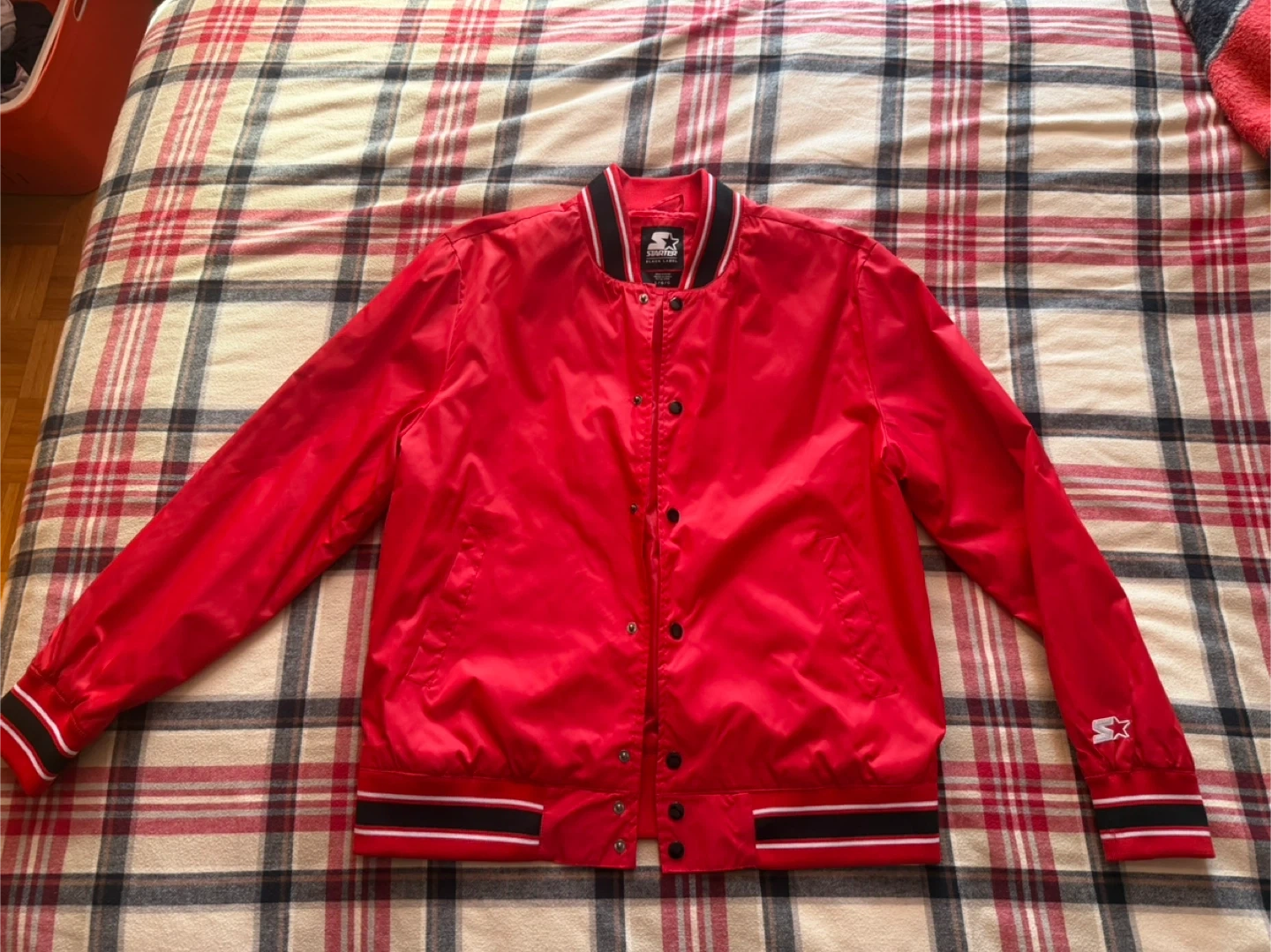 Starter red bomber jacket. It's a classic style with ribbed cuffs and collar. Satin-like material. Has two side pockets.