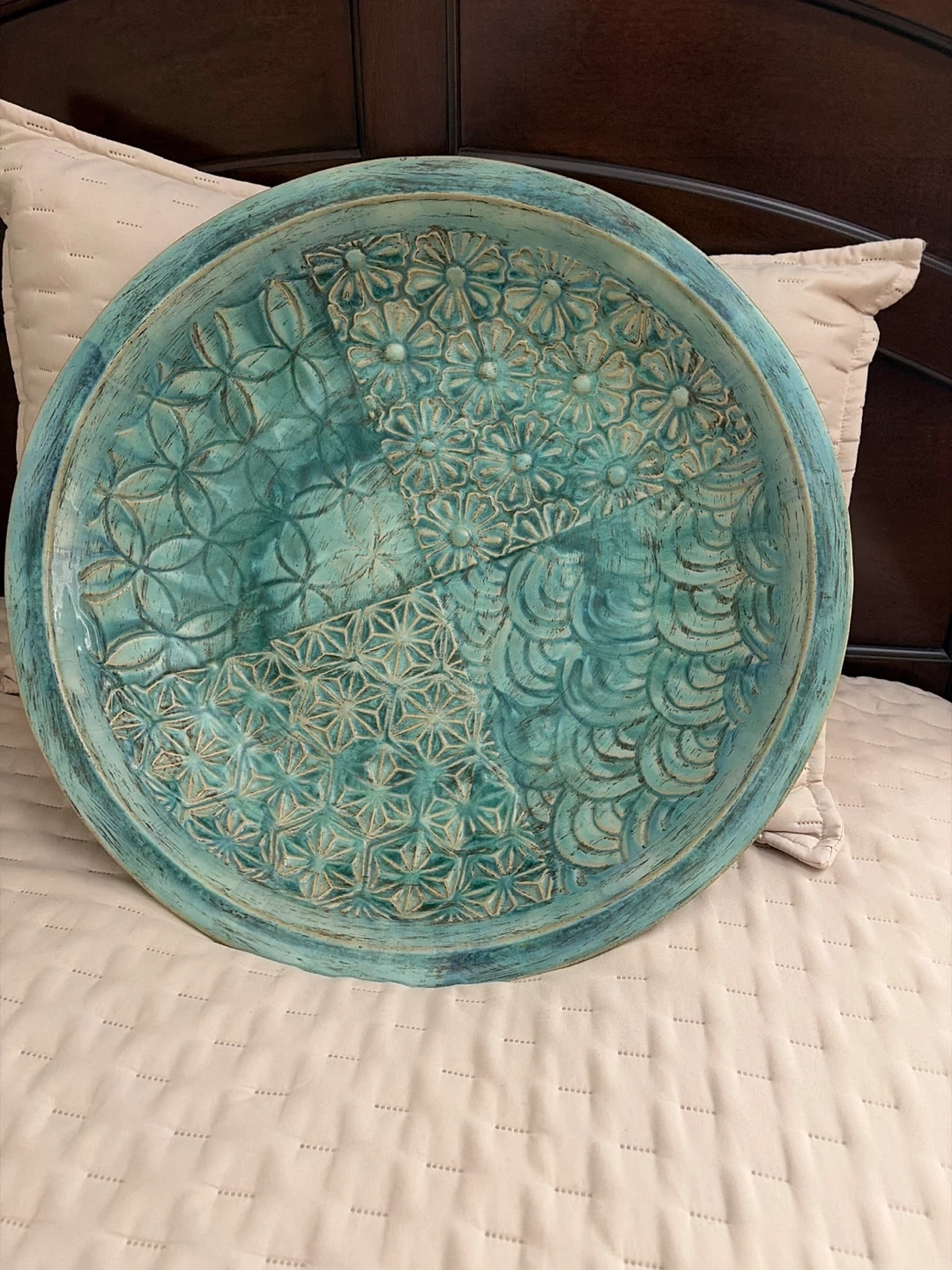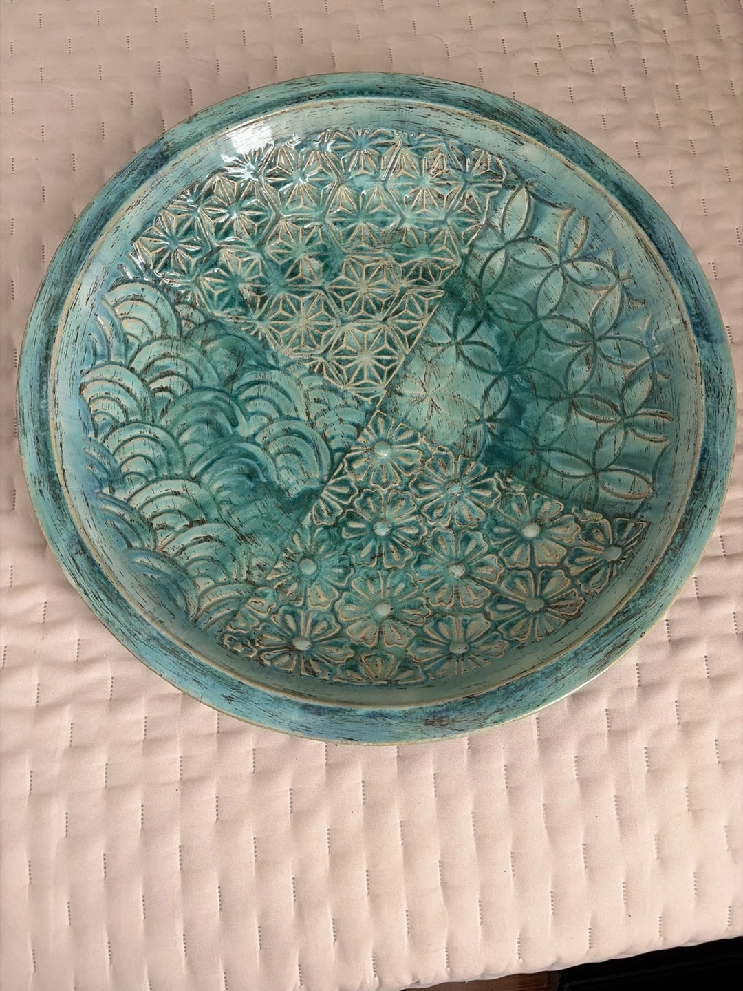 This is a beautiful turquoise ceramic tray with intricate embossed patterns. It features a combination of floral and geometric designs, as well as a wave-like motif. It's perfect for display on a table or shelf. Measures approximately 20” inches in diameter.