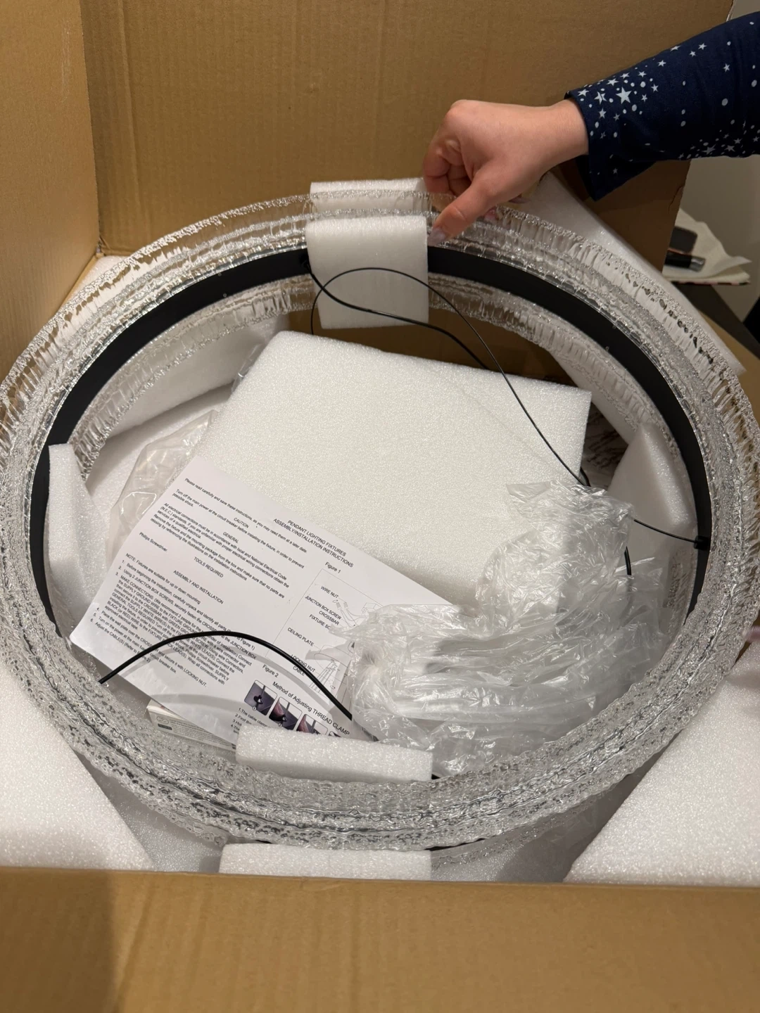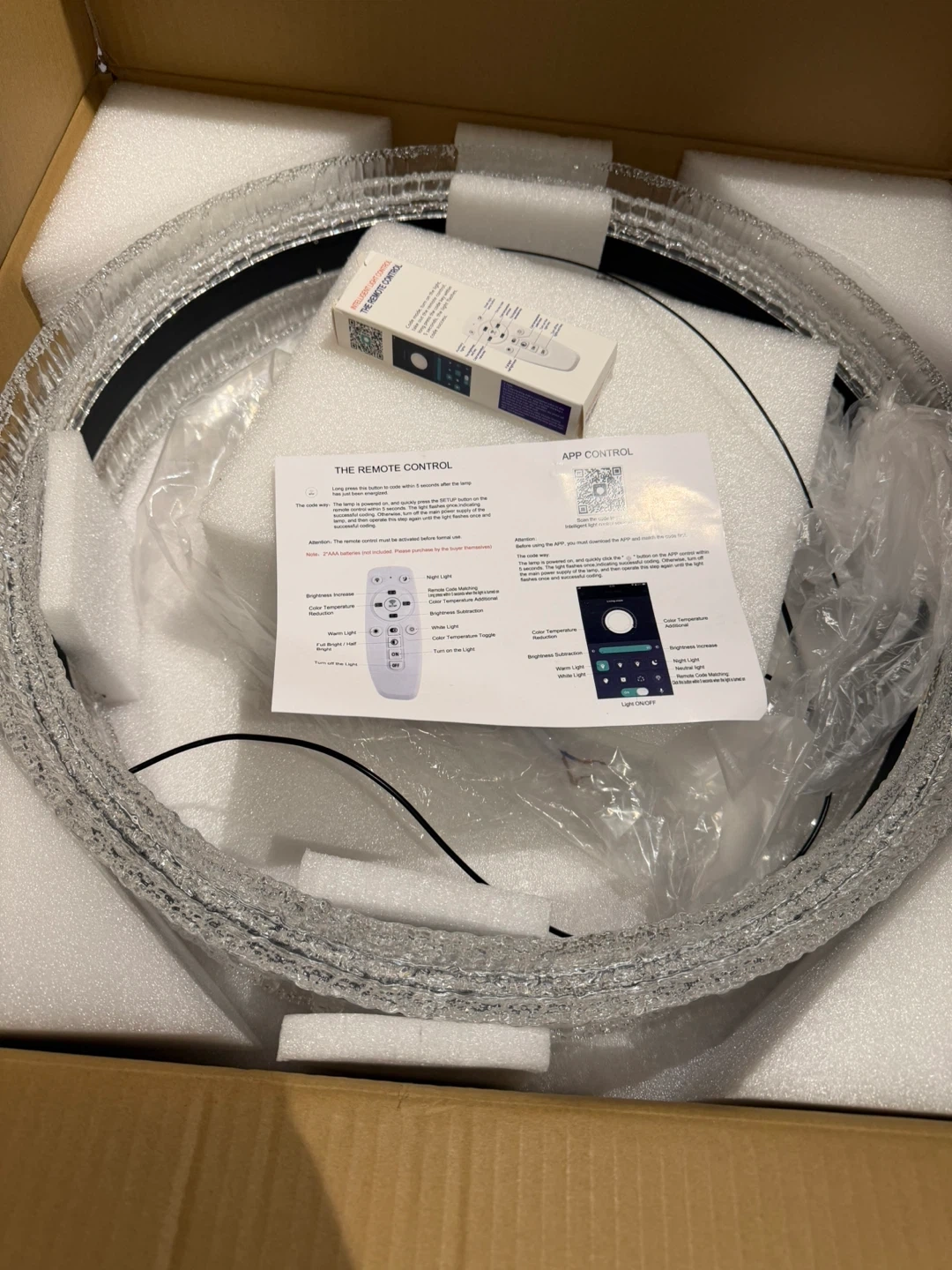 A stunning crystal ring chandelier designed to add a touch of elegance to any room. It features a sleek black finish and includes a remote control for easy adjustments. This fixture is app-controllable for added convenience. It's perfect for dining rooms or living areas.
