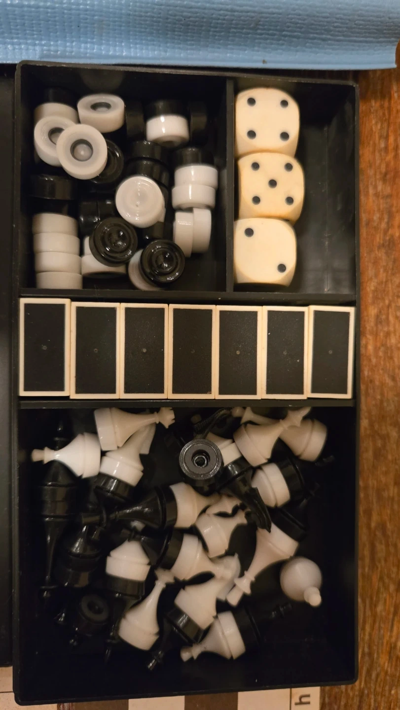 Compact travel game set includes chess pieces, checkers, and dice. Folds for easy storage and portability. Great for trips or game nights on the go! Or as a collectible item to keep or gift.