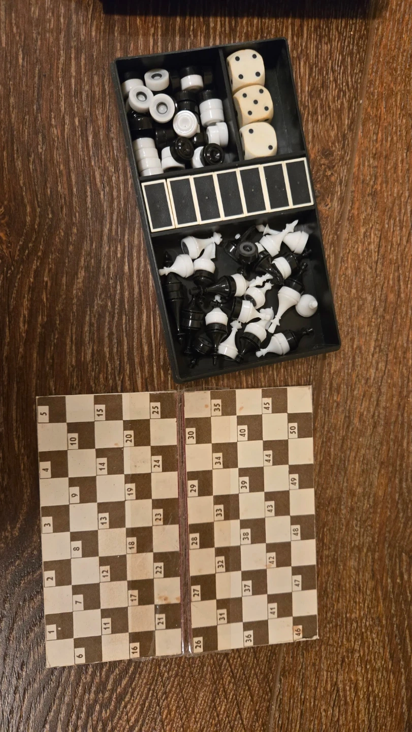 Compact travel game set includes chess pieces, checkers, and dice. Folds for easy storage and portability. Great for trips or game nights on the go! Or as a collectible item to keep or gift.