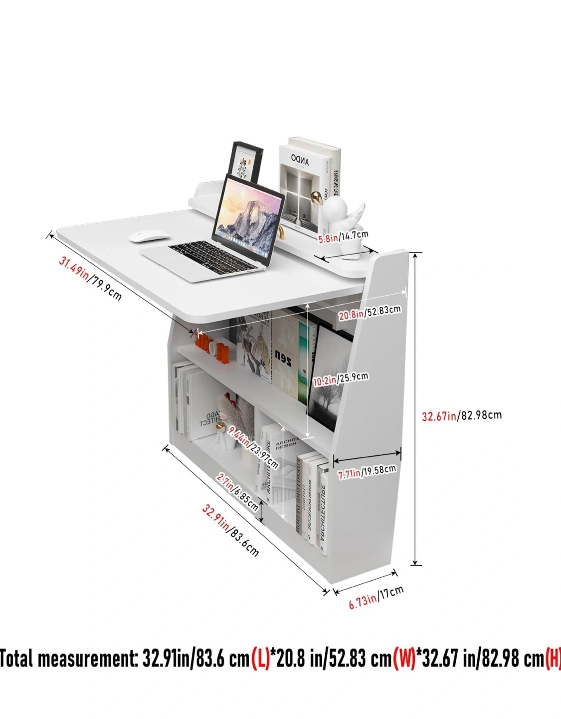 This is a 2-in-1 design bookshelf that also functions as a folding laptop desk. It's white and features a foldable design for space-saving. Dimensions are 32.91in L x 20.8in W x 32.67in H. Perfect for small spaces!