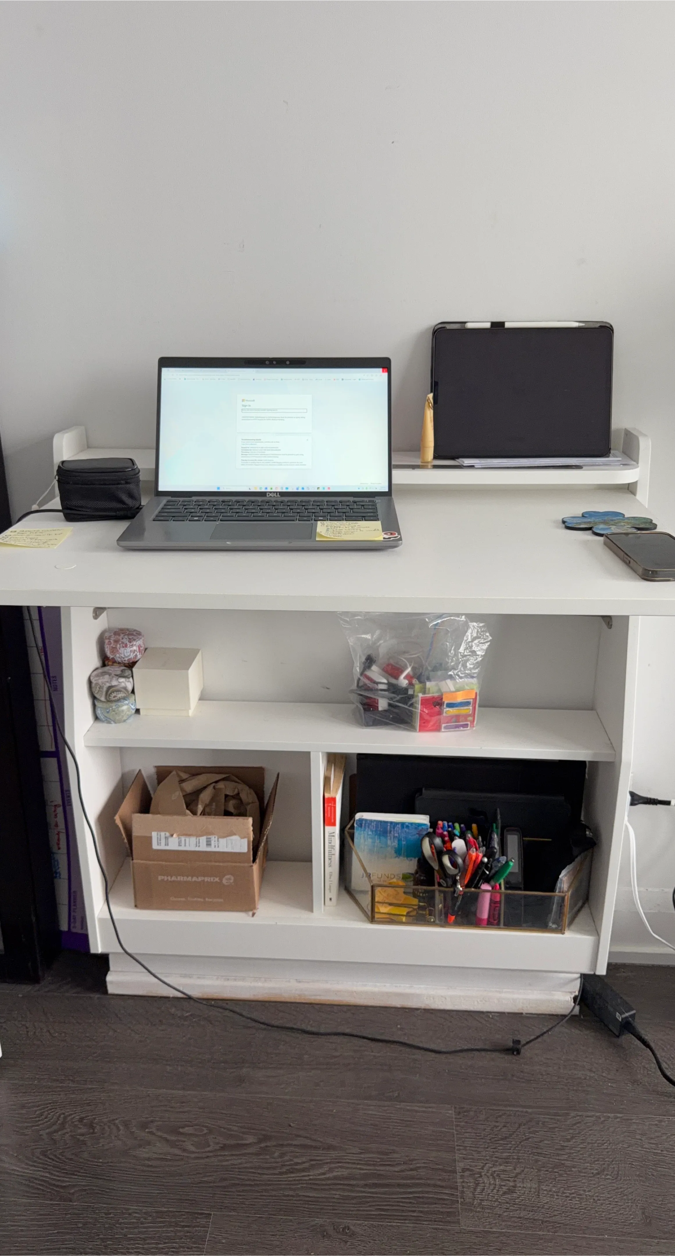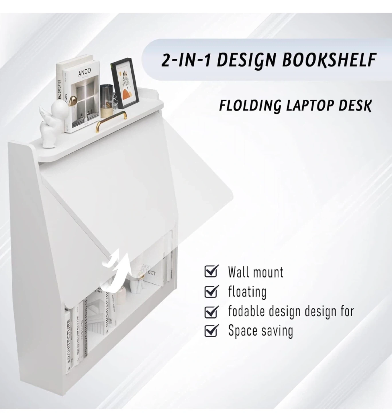 This is a 2-in-1 design bookshelf that also functions as a folding laptop desk. It's white and features a foldable design for space-saving. Dimensions are 32.91in L x 20.8in W x 32.67in H. Perfect for small spaces!