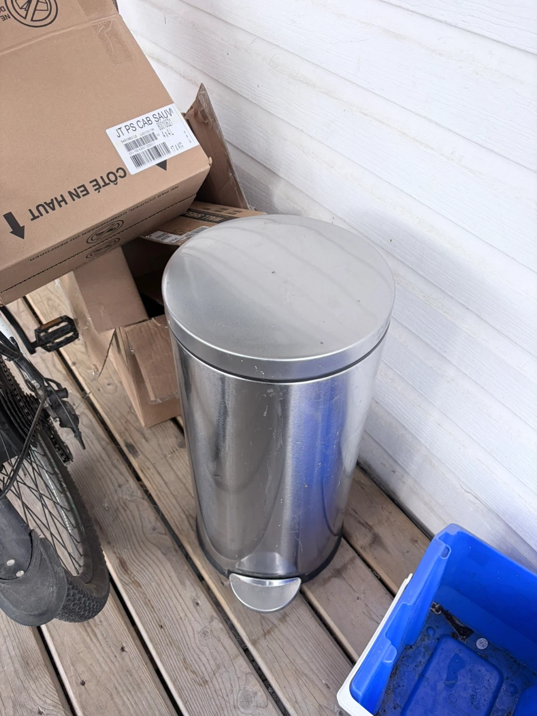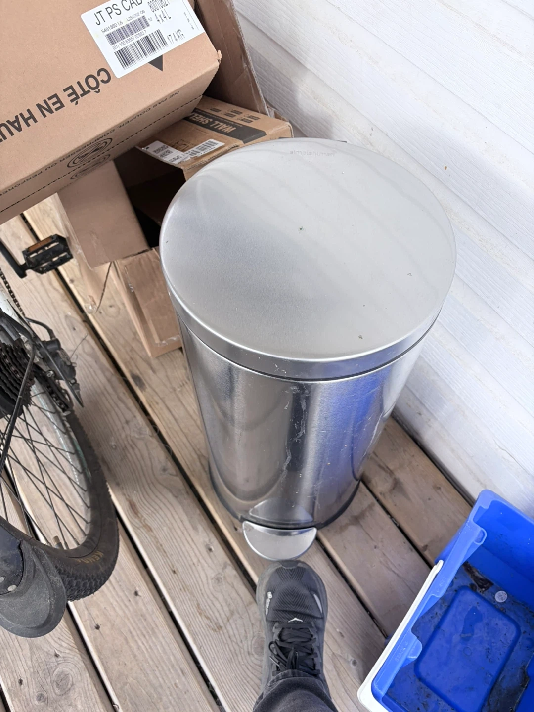 This is a Simplehuman stainless steel step trash can. It's pedal-operated and has a clean silver finish. This can is a good size for a kitchen or garage.