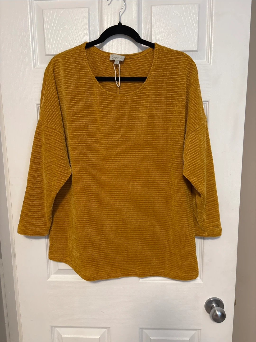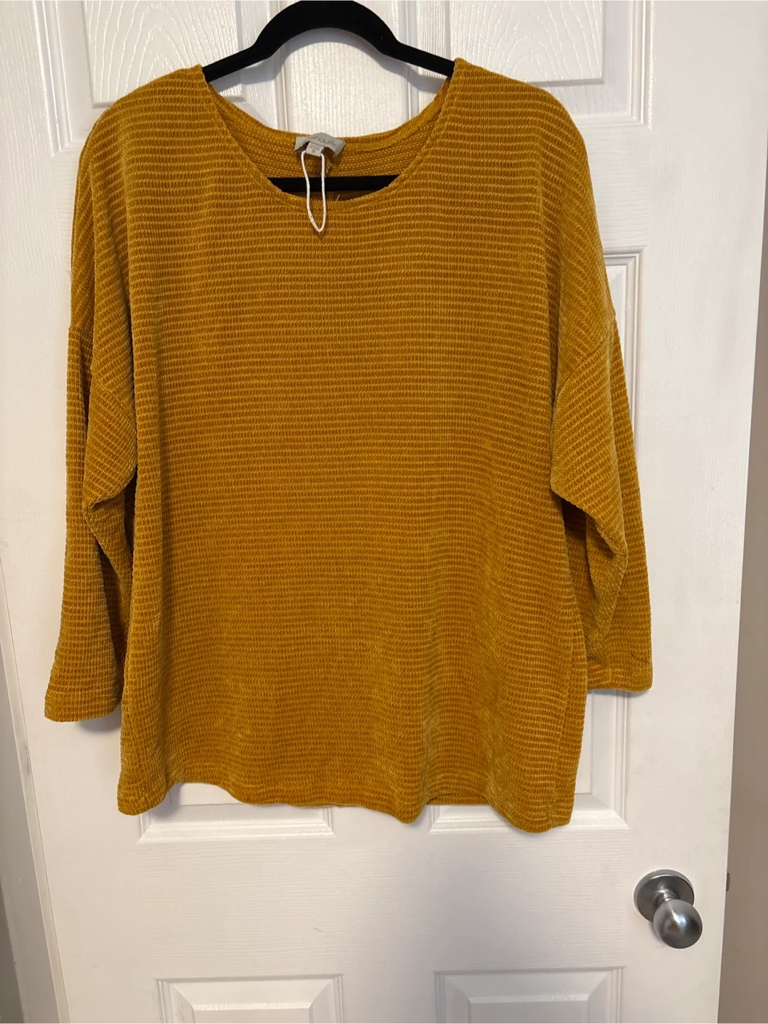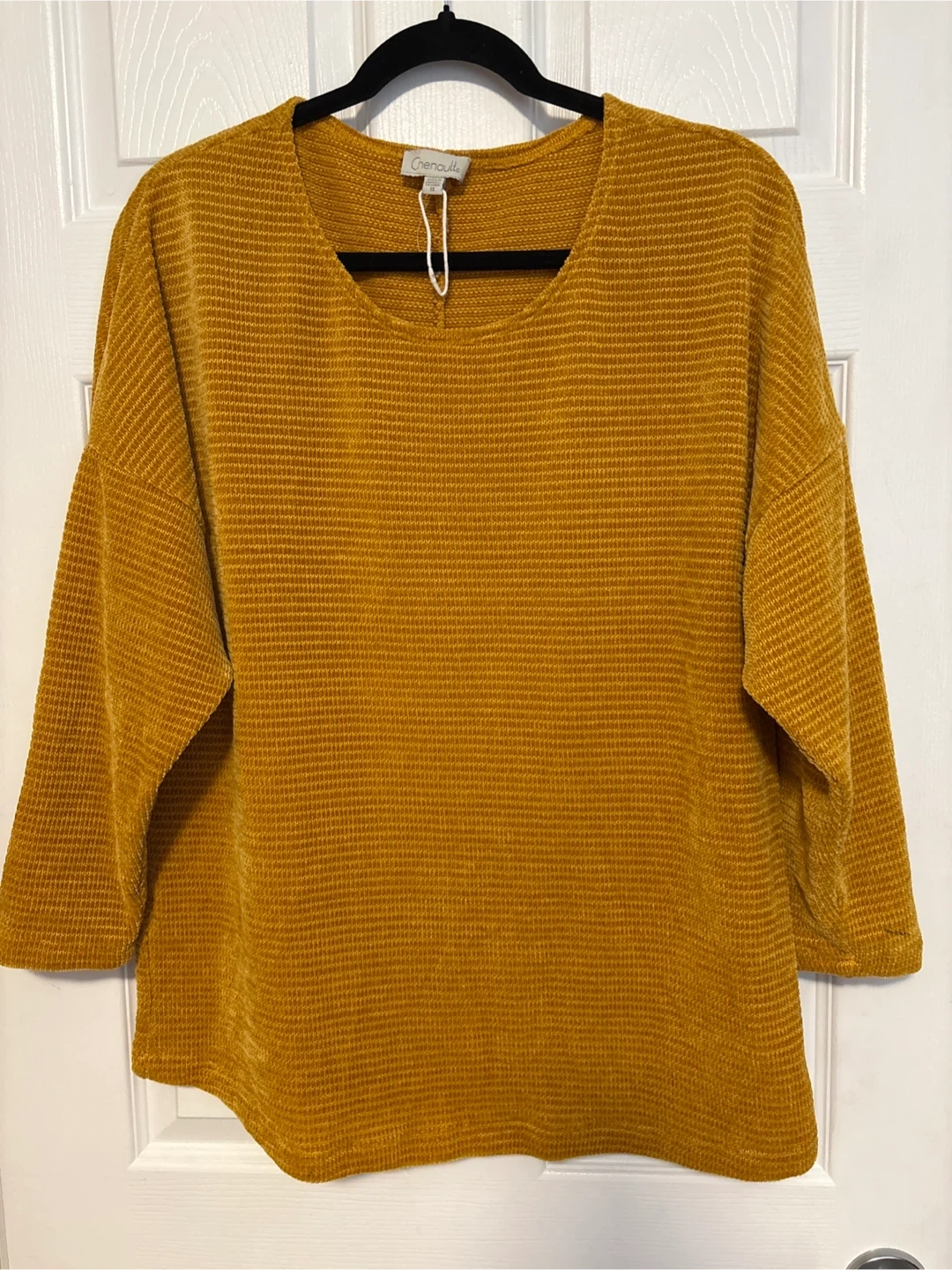 A Chenault long-sleeve top in a mustard yellow colour. It features a waffle knit texture and a relaxed fit.size 1X excellent condition