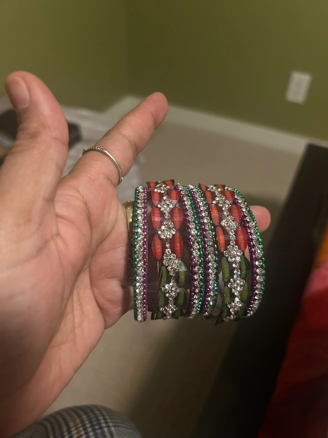 These colourful bangles are adorned with beads and rhinestones. They're designed in a vibrant mix of magenta and green.Great for adding a festive touch to any outfit!