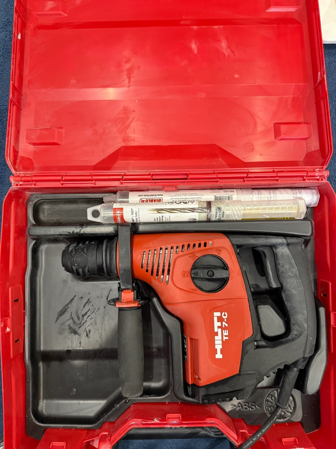This Hilti TE 7-C rotary hammer drill comes in its original red carrying case. Includes drill bits. Manufactured in September 2021. It's powered by a 120V, 6.3A motor with a variable speed of 0-900 RPM. It can drill up to 1" in concrete and 1/2" in steel.