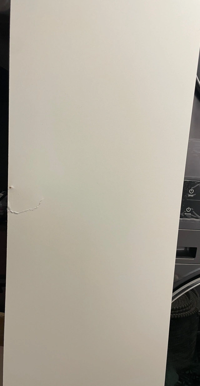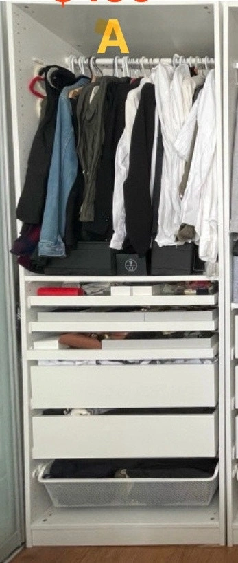 This nearly new Ikea Pax wardrobe offers a sleek storage solution, featuring a pristine white finish and a custom interior layout with multiple drawers and hanging space, perfect for organizing your wardrobe. Colour: White. Condition: Used. Includes 2 jewelry organizers. Dimensions: 75cm (W) x 201cm (H) x 58.0cm (D). There is slight damage on the back panel that was repaired (as shown in the last 2 photos). This will not be visible when clothes are hanging on the rod. The frames are disassembled for easier transport, but the drawers will remain assembled. Retail price after tax was $610.