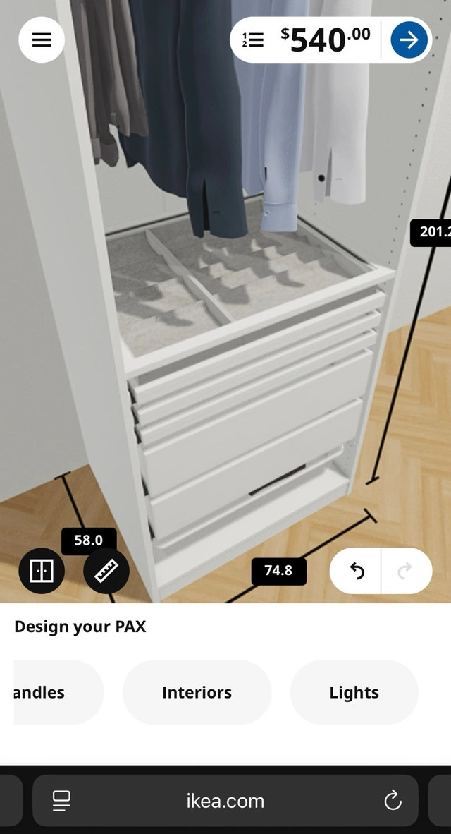 This nearly new Ikea Pax wardrobe offers a sleek storage solution, featuring a pristine white finish and a custom interior layout with multiple drawers and hanging space, perfect for organizing your wardrobe. Colour: White. Condition: Used. Includes 2 jewelry organizers. Dimensions: 75cm (W) x 201cm (H) x 58.0cm (D). There is slight damage on the back panel that was repaired (as shown in the last 2 photos). This will not be visible when clothes are hanging on the rod. The frames are disassembled for easier transport, but the drawers will remain assembled. Retail price after tax was $610.