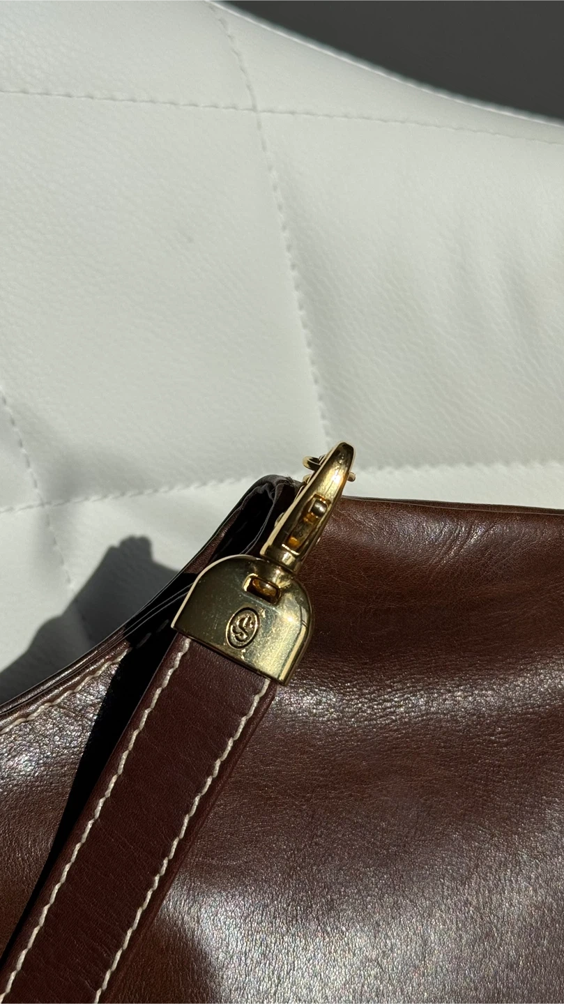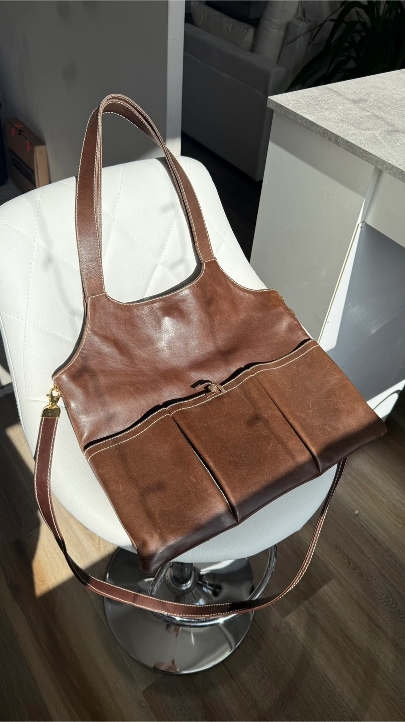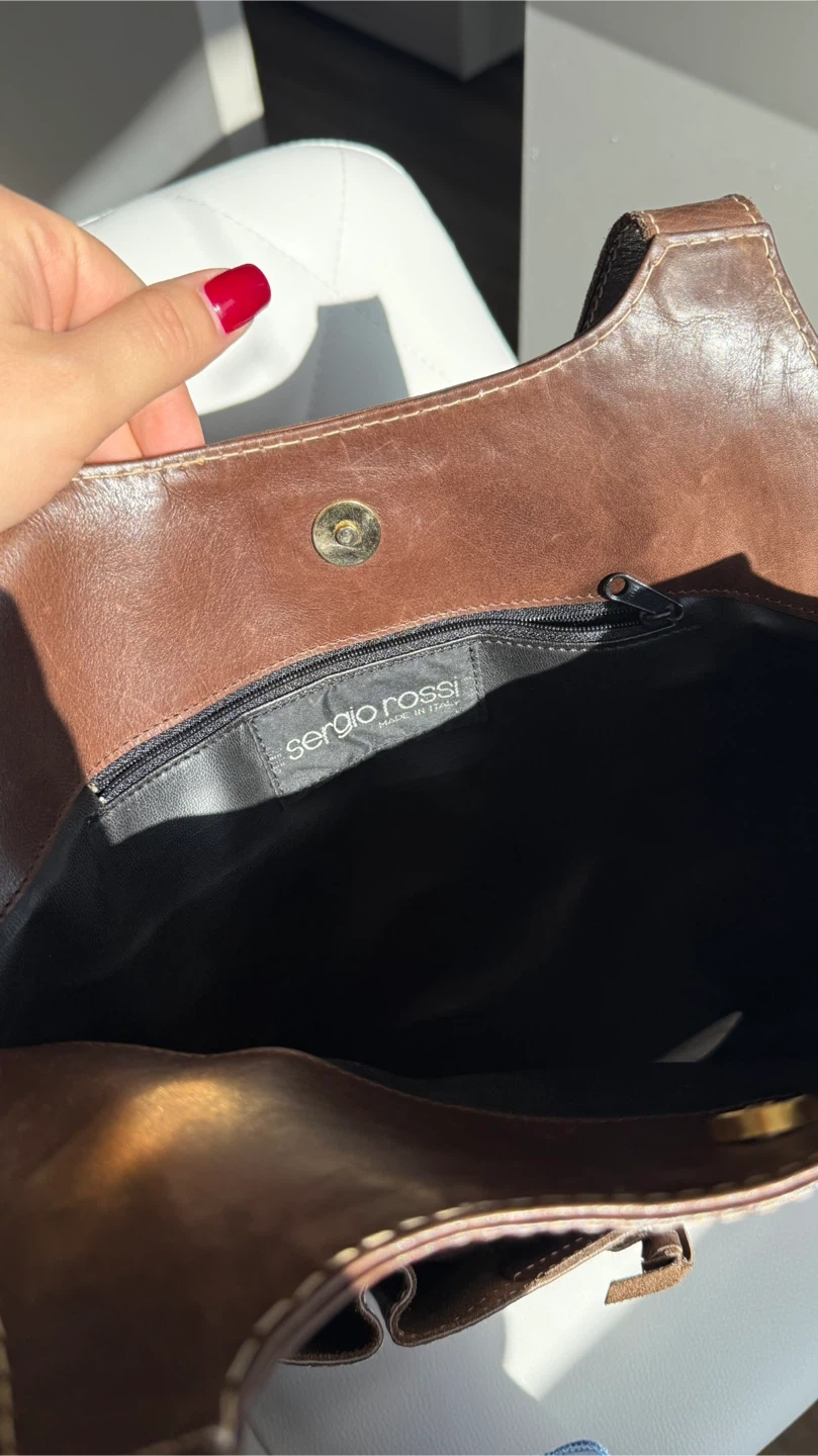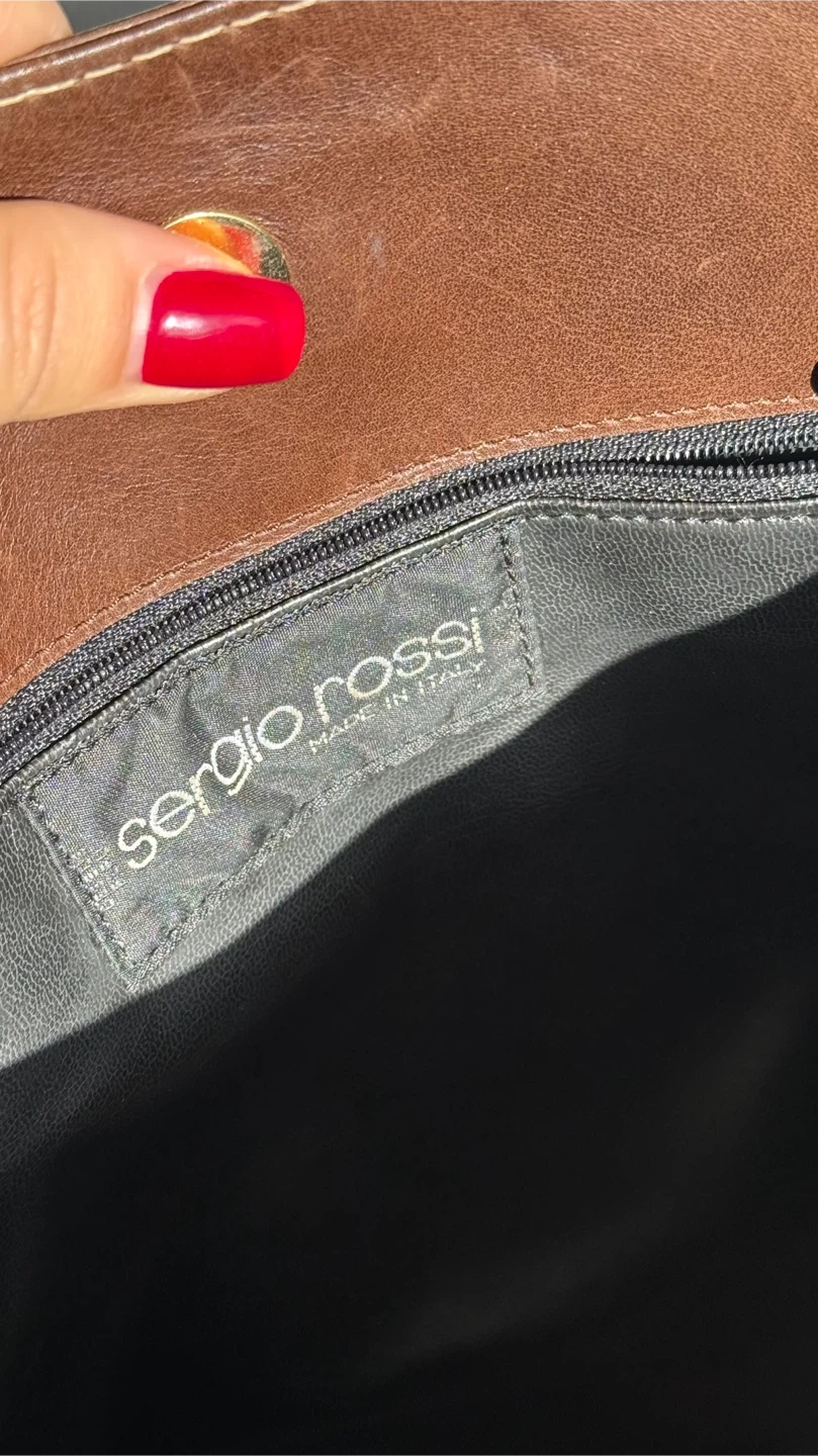 Sergio Rossi tote bag made in Italy. It's brown leather with a snap closure. This bag has multiple pockets on the front.