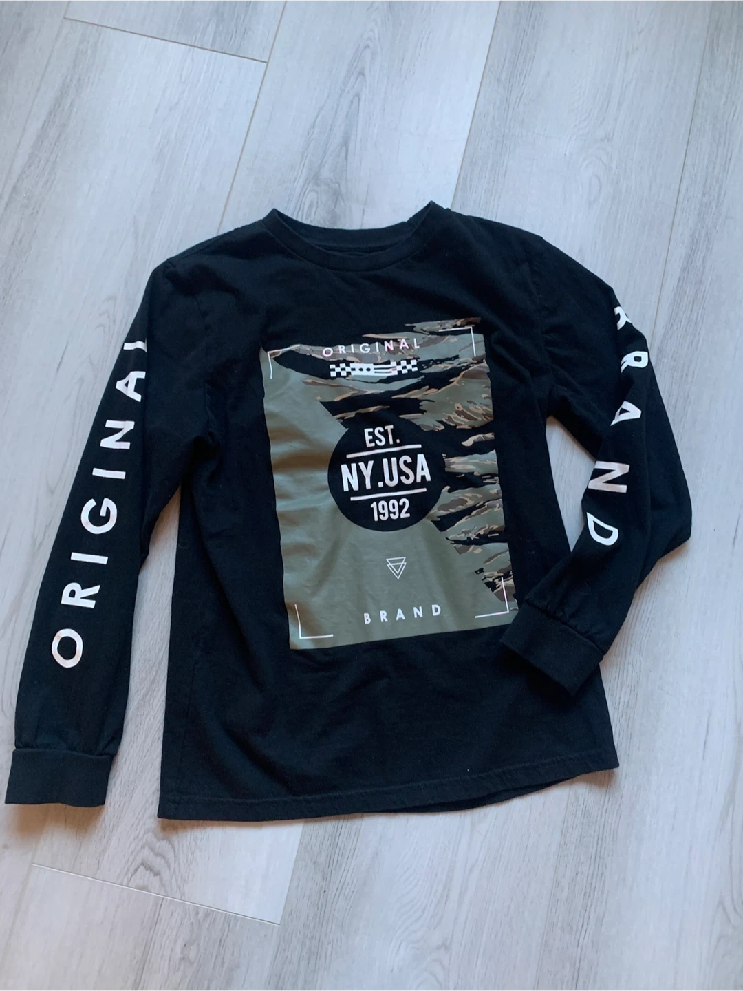 Selling a couple of kids' shirts. One is a red t-shirt with "CANADA IS AWESOME" printed on it. The other is a black long-sleeved shirt with "ORIGINAL BRAND EST. NY.USA 1992" on it. Both are in good condition and ready for a new home!