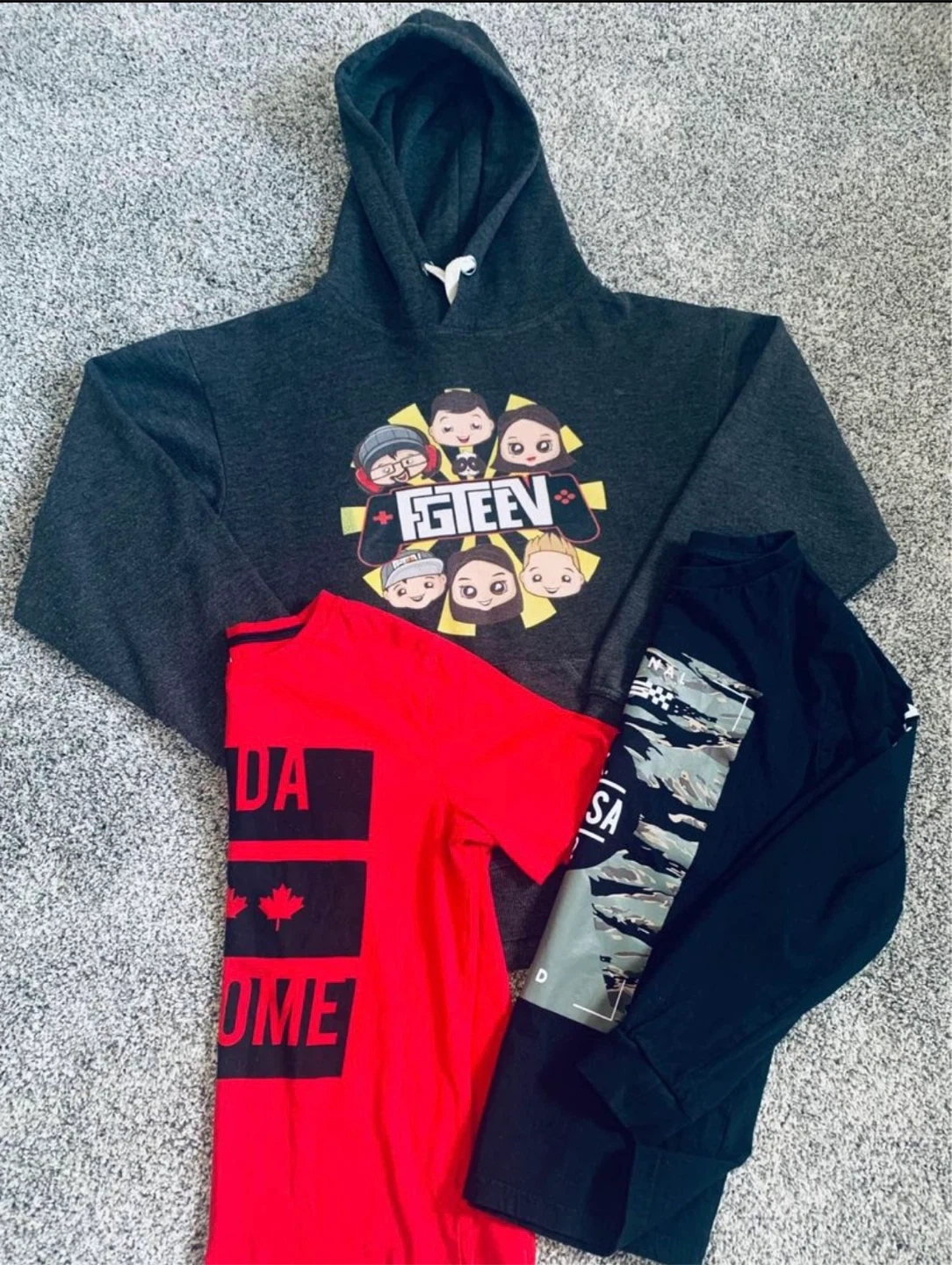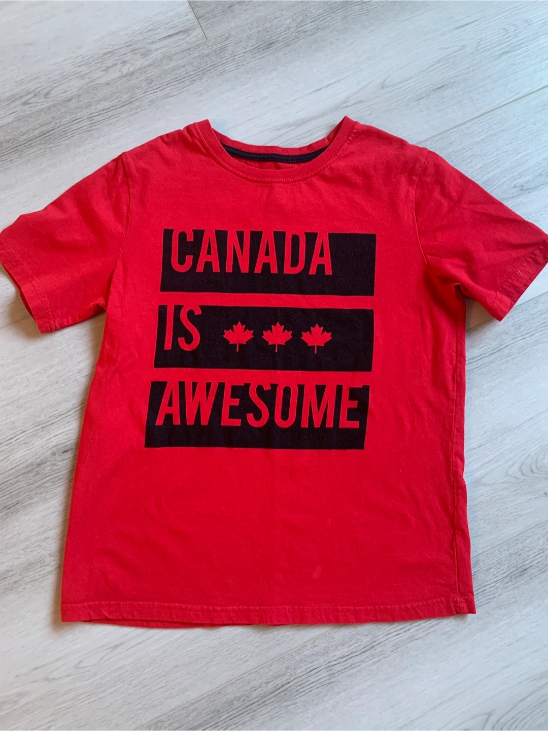 Selling a couple of kids' shirts. One is a red t-shirt with "CANADA IS AWESOME" printed on it. The other is a black long-sleeved shirt with "ORIGINAL BRAND EST. NY.USA 1992" on it. Both are in good condition and ready for a new home!