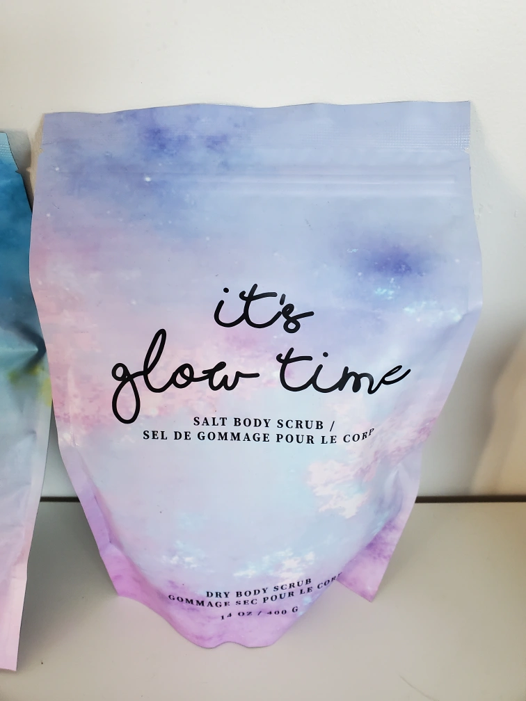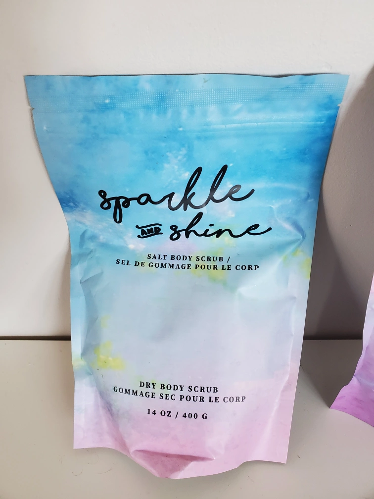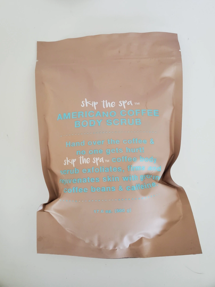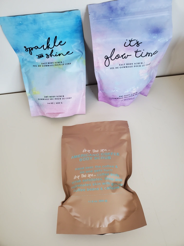 Three different Skip The Spa body scrubs. One Americano Coffee Body Scrub (17.6 oz), one Sparkle and Shine Salt Body Scrub (14 oz), and one It's Glow Time Salt Body Scrub (14 oz). Gently exfoliates and moisturizes skin. Unopened, new.