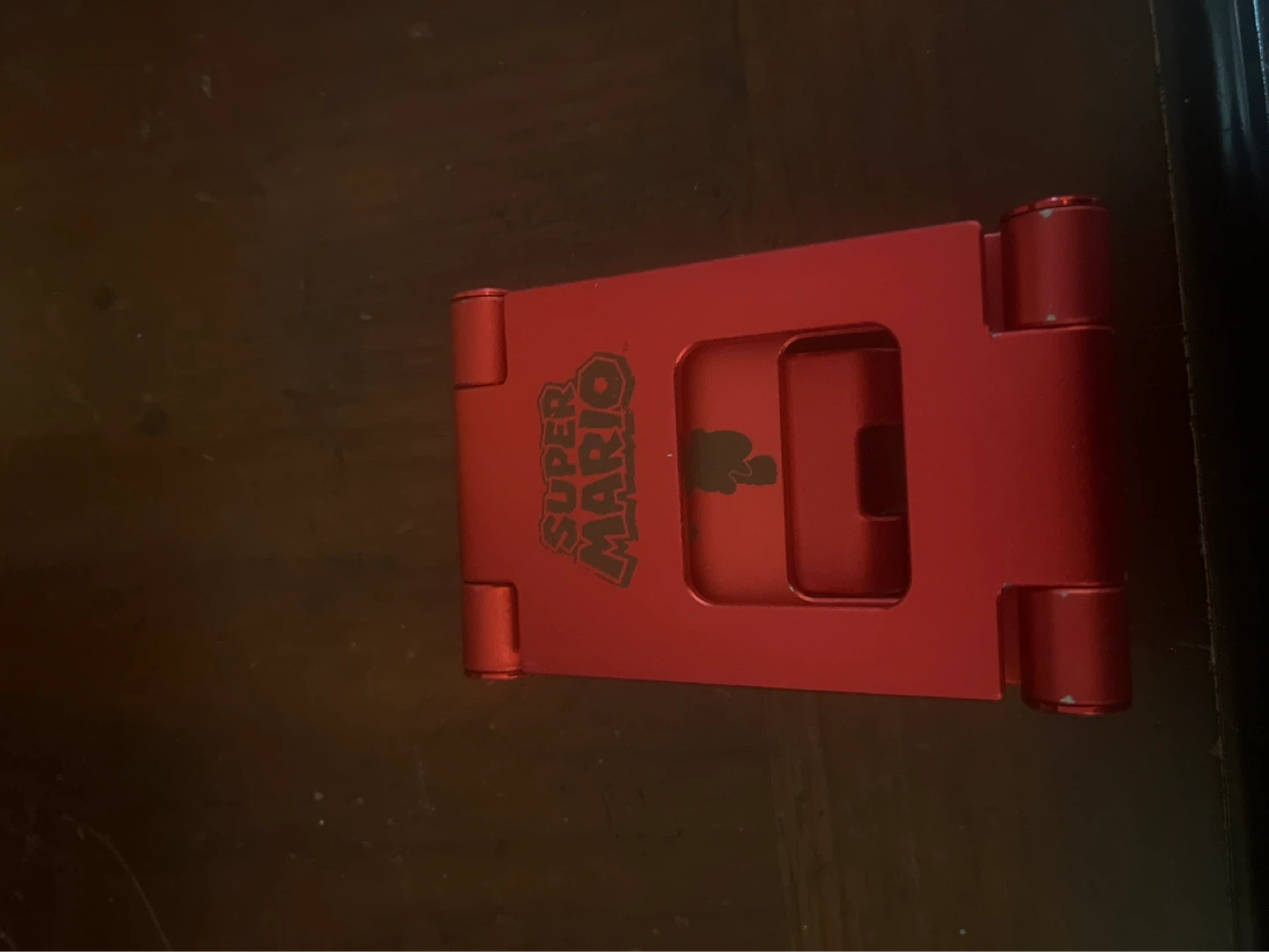 This is a red phone stand featuring the Super Mario logo. It's made of metal and is adjustable. It's a fun accessory for any Mario fan!