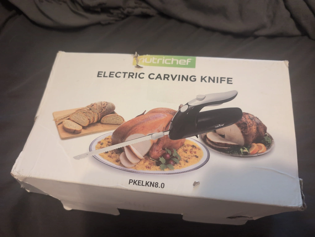 Selling a NutriChef electric carving knife, model PKELKN8.0. It comes with the box and all original components. Perfect for carving bread, turkey, or ham!