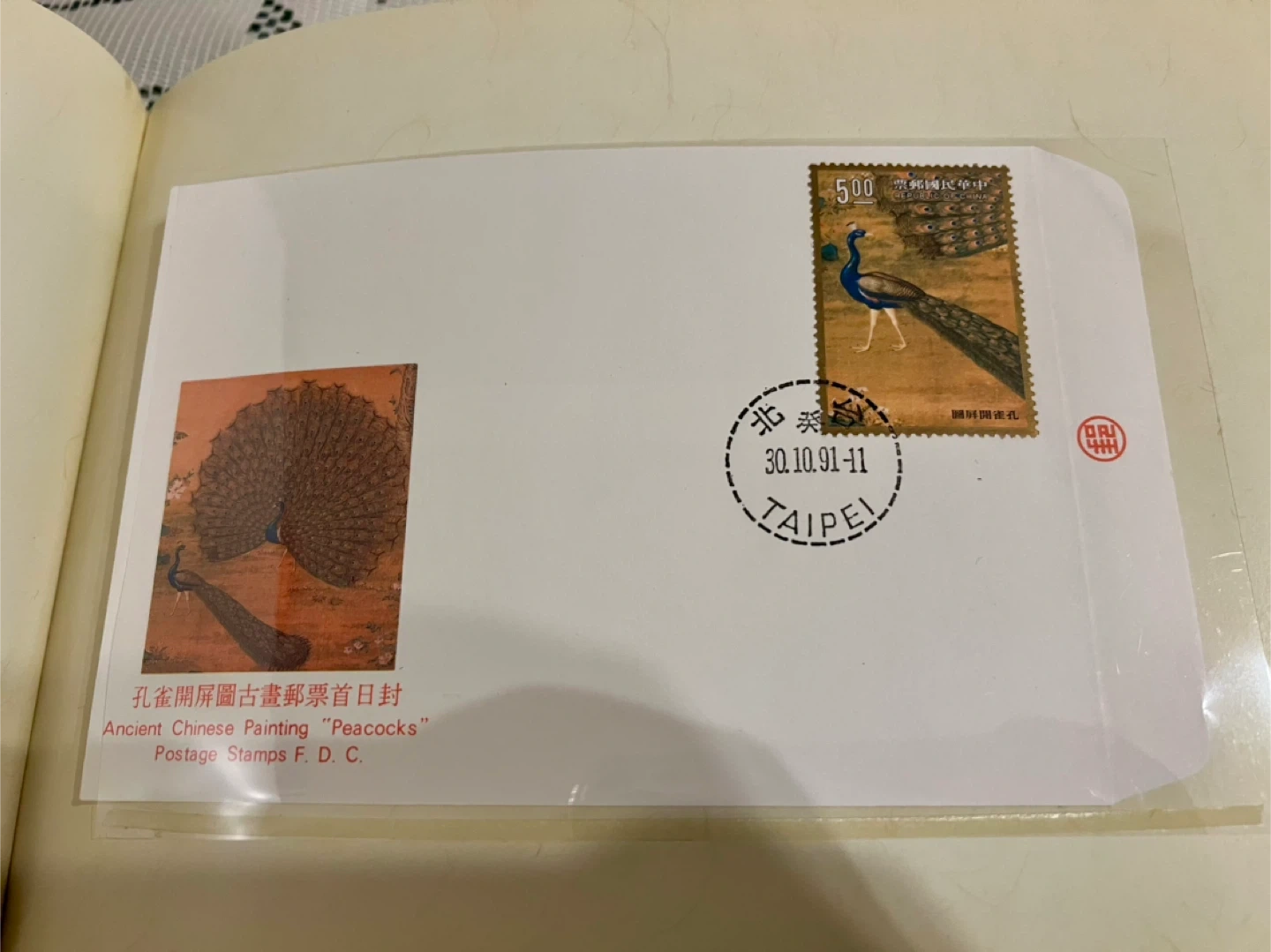 This is a collection of ancient Chinese painting "Peacocks" postage stamps first-day cover. Includes a 500 and 2000 stamp. The cover is dated 30.10.91 in Taipei. It's a lovely piece for collectors!