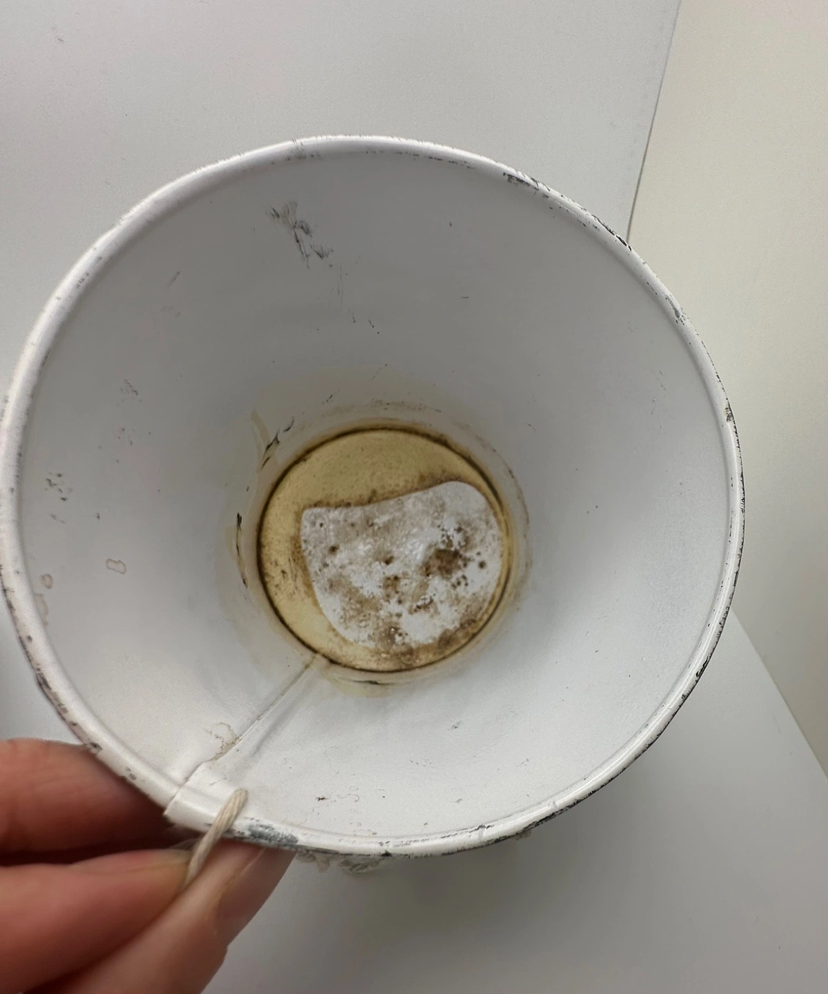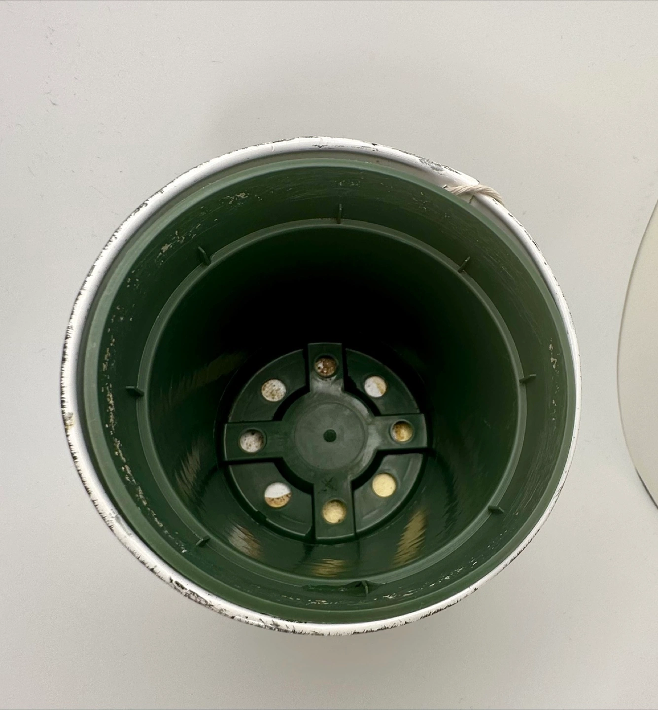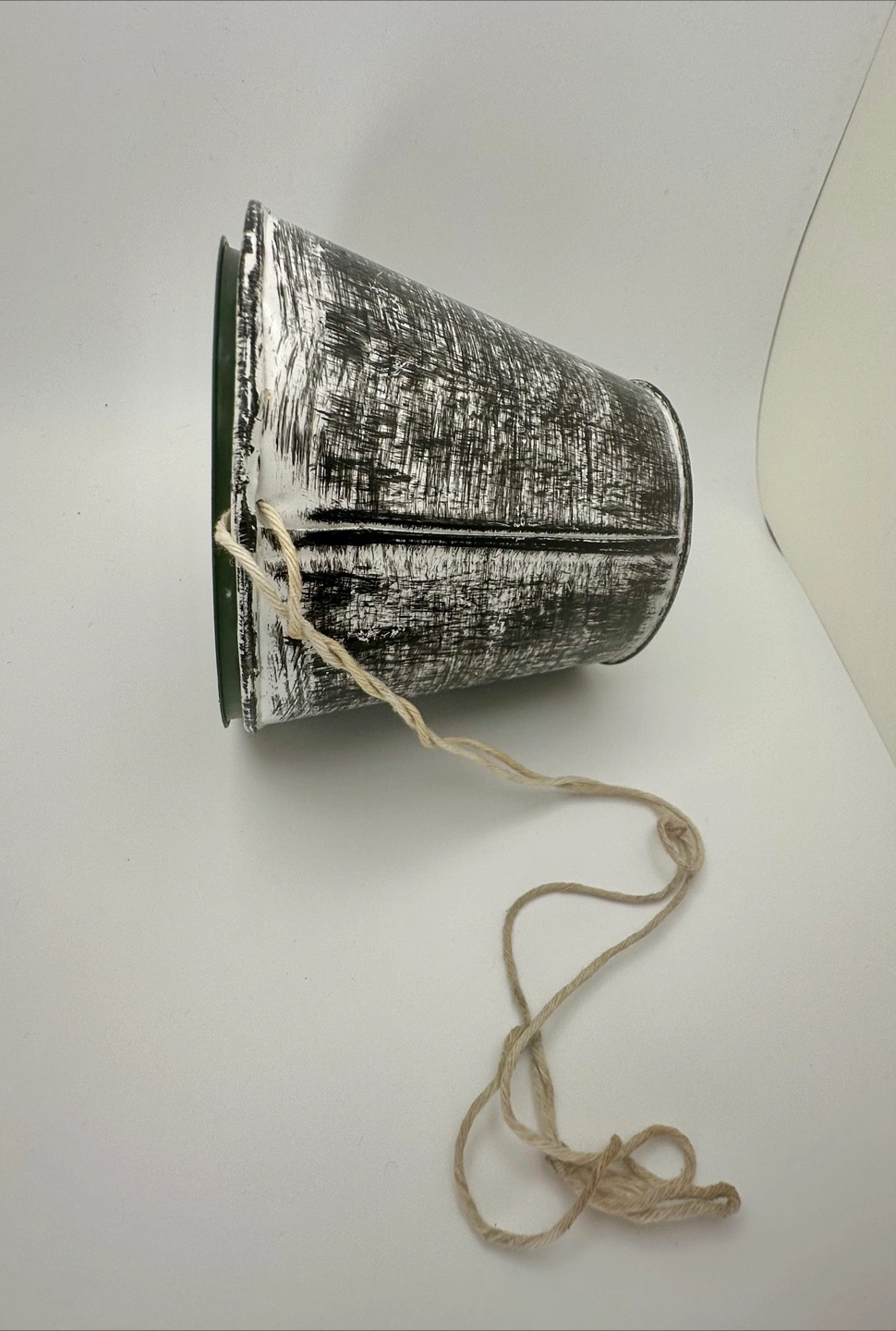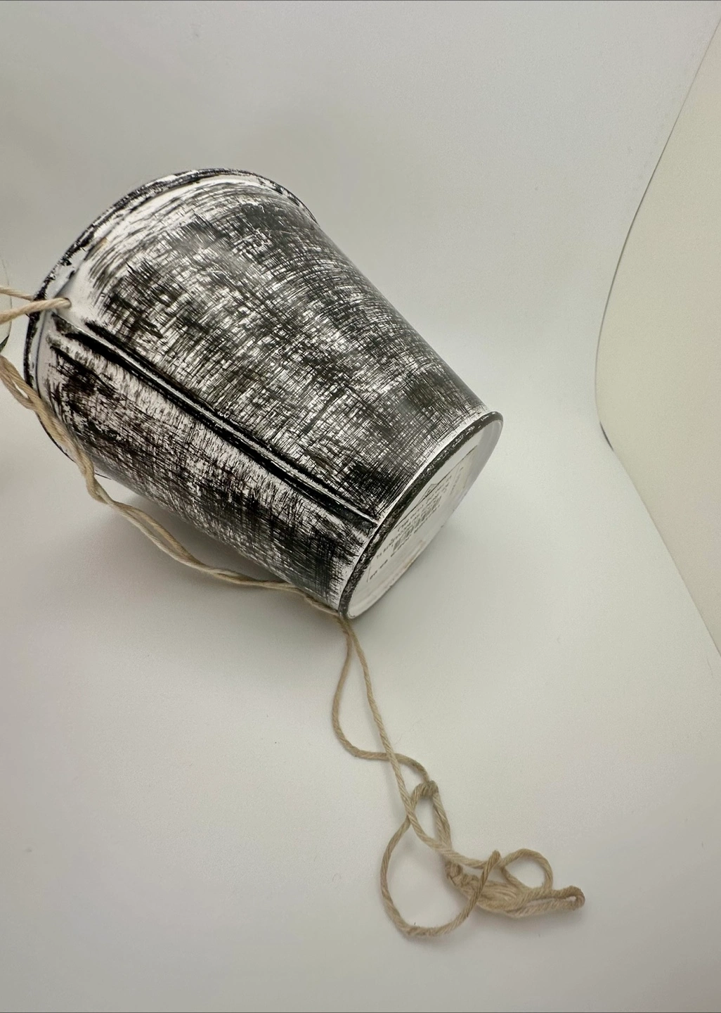 Black and white distressed finish with a hole for hanging using a rope or string. Comes with a green 3.75-inch plastic nursery pot insert. Perfect for small plants or flowers—especially striking with pink or light-toned greenery.