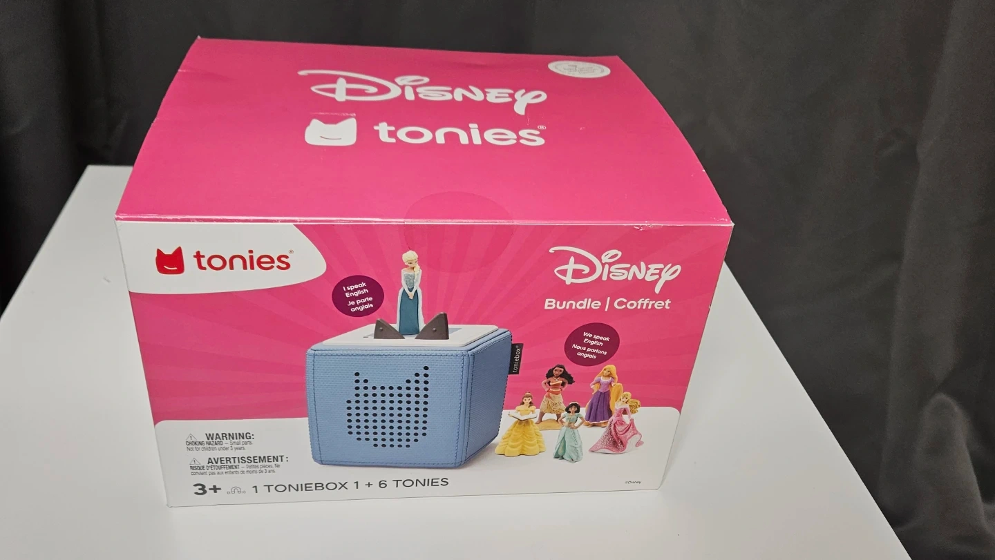 This bundle includes the blue Toniebox and 6 Disney Princess Tonies. Stories and songs play from the Toniebox when a Tonie figure is placed on top. It has volume control and seven hours of battery life. Perfect for little Disney fans!