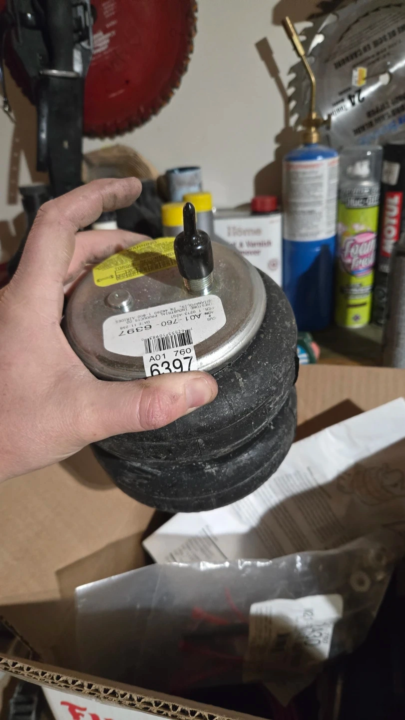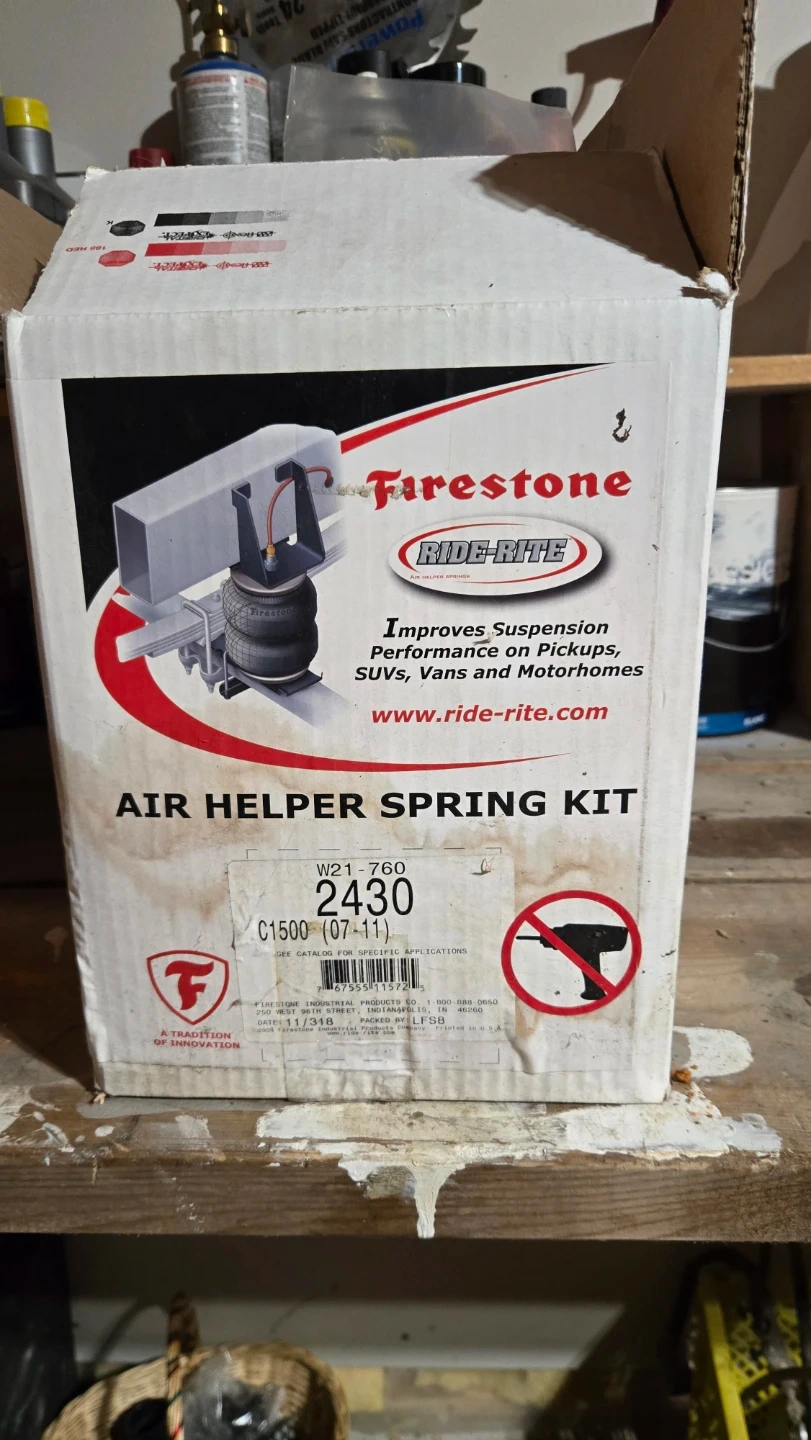 This is a Firestone Ride-Rite Air Helper Spring Kit, model W21-760 2430. It's designed to improve suspension performance on pickups, SUVs, vans, and motorhomes. The kit includes air springs and related hardware. It was manufactured on 07-11. As well as a universal on board air compressor