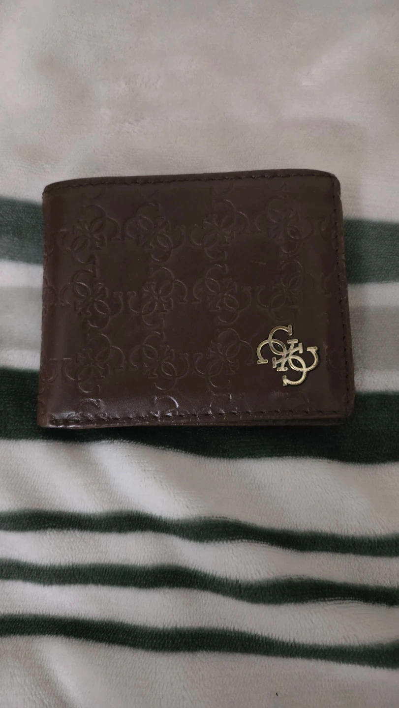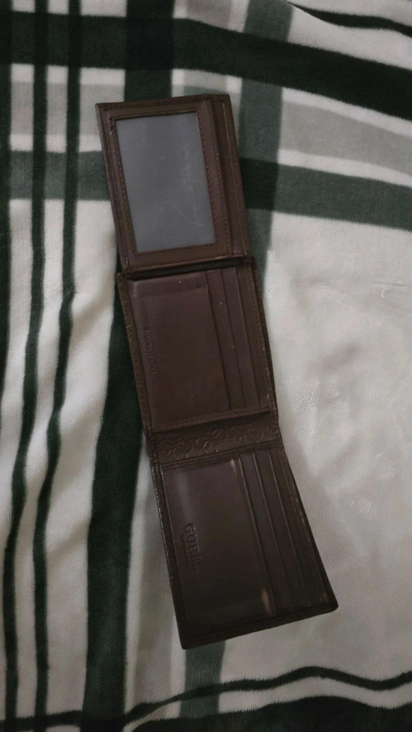 Brown bifold wallet from Guess. Features a patterned exterior with the Guess logo emblem. Inside has multiple card slots and a clear ID window. Leather material.