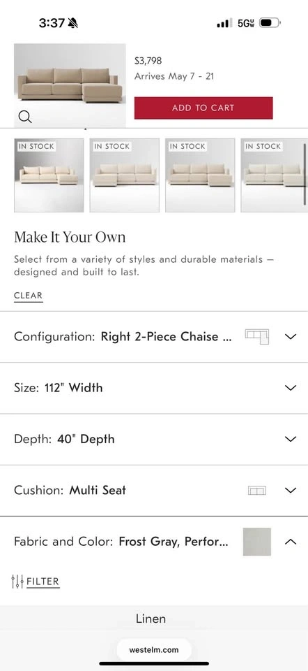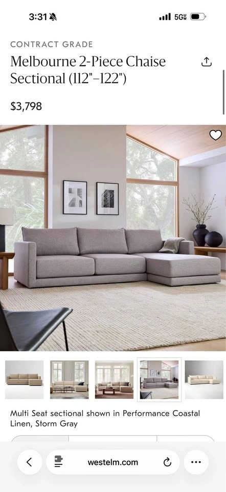 Multi Seat sectional shown in Performance Coastal Linen, Storm Gray. Pickup in Flatiron by 4/3. Doorman and elevator building.