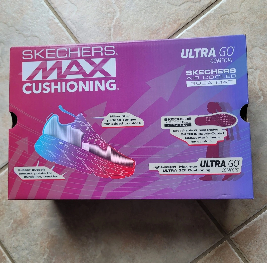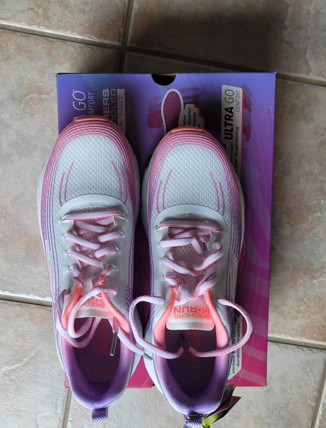 New Skechers running shoes. Ultra Go Comfort. Air cooled Goga Mat. Lightweight and cushioned. Purple, pink and white colour scheme.