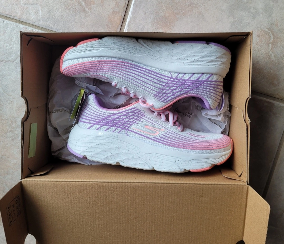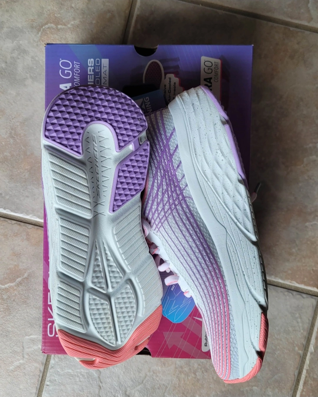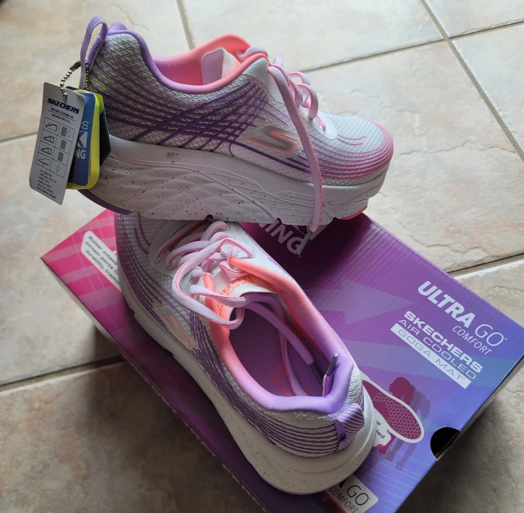 New Skechers running shoes. Ultra Go Comfort. Air cooled Goga Mat. Lightweight and cushioned. Purple, pink and white colour scheme.
