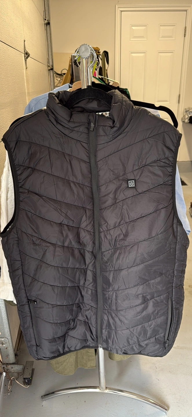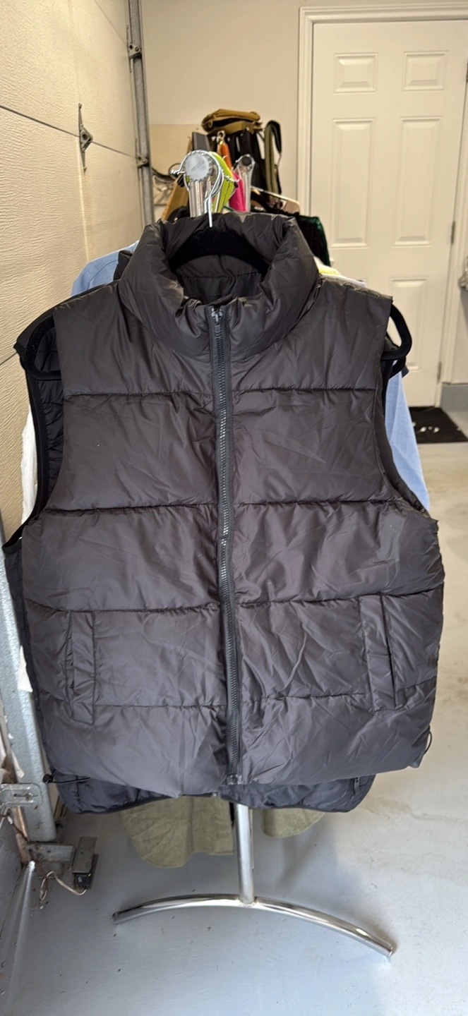 Brand new men's black puffer vest. Features a zipper closure and multiple pockets. Also included is a light blue rain jacket, great for spring showers.