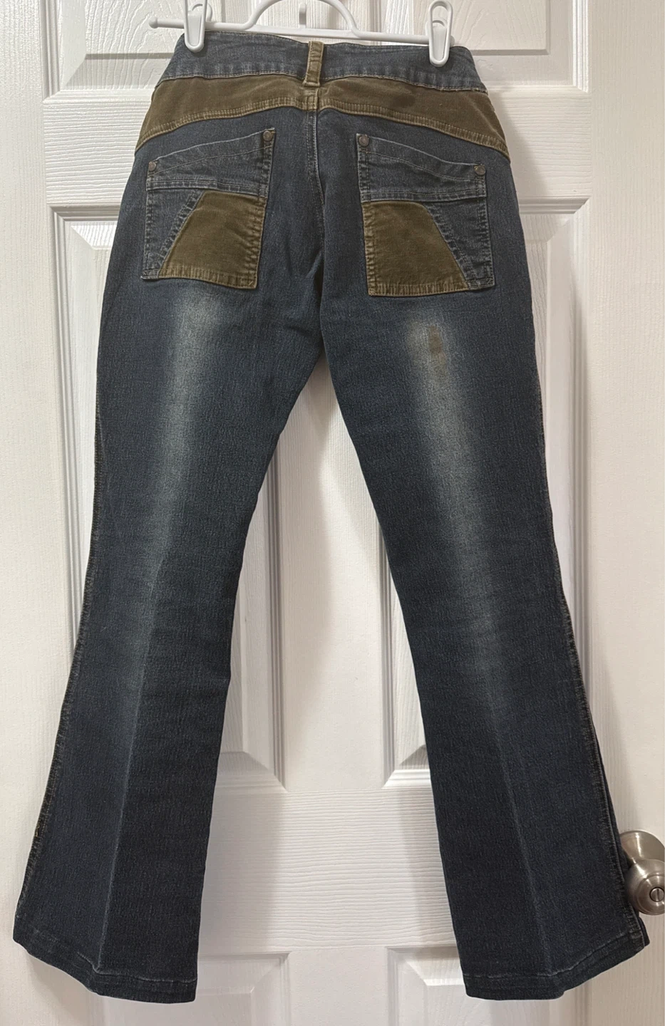 These Stars jeans. They feature dark wash denim with subtle fading and distressed details. The waistband and pocket accents are made of a brown corduroy material. The jeans have a flare leg opening. Faux front pockets