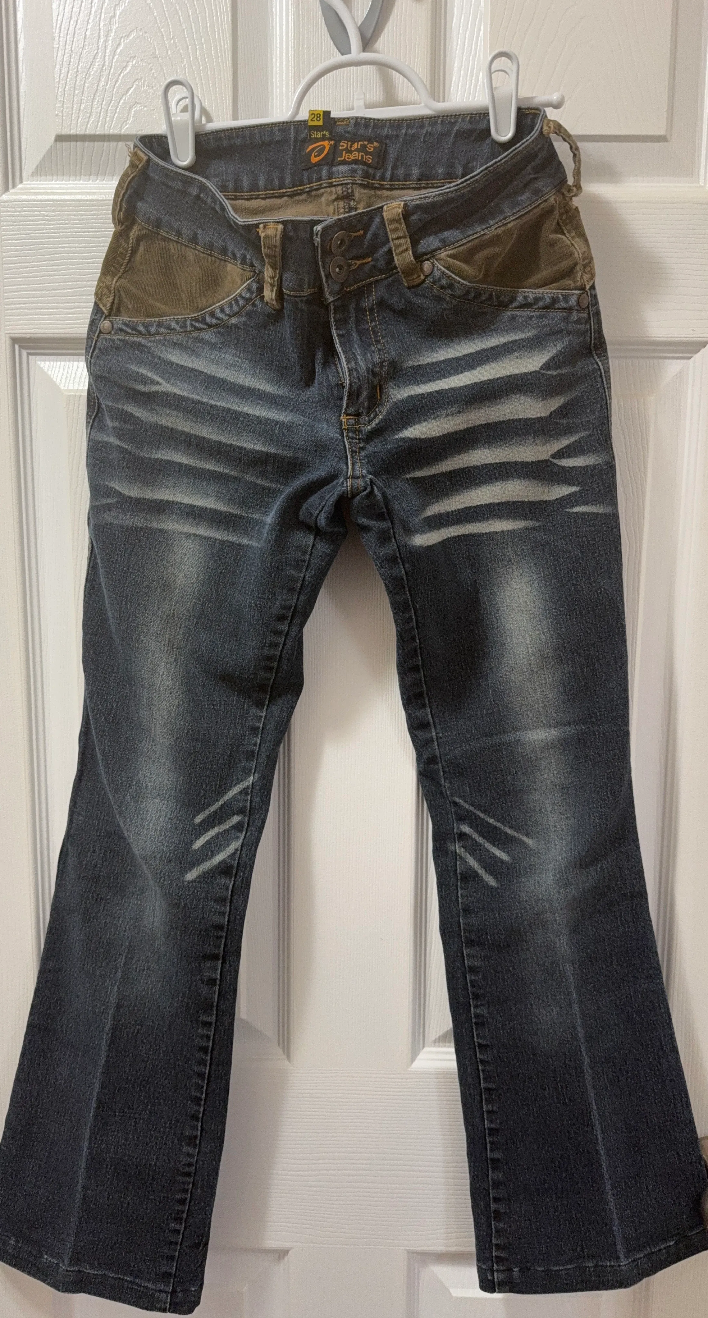 These Stars jeans. They feature dark wash denim with subtle fading and distressed details. The waistband and pocket accents are made of a brown corduroy material. The jeans have a flare leg opening. Faux front pockets
