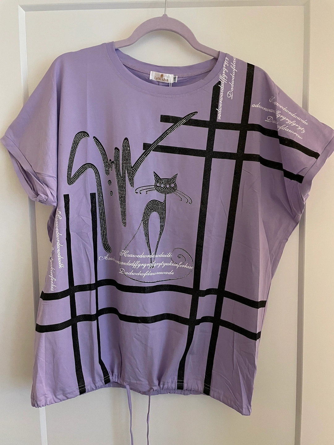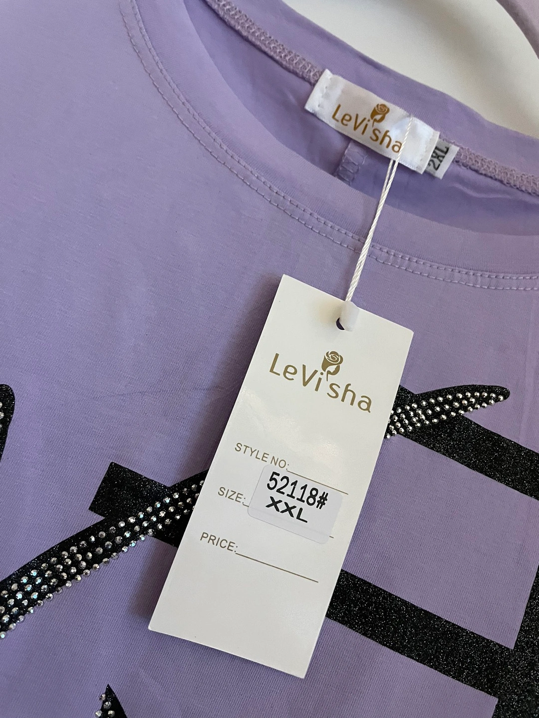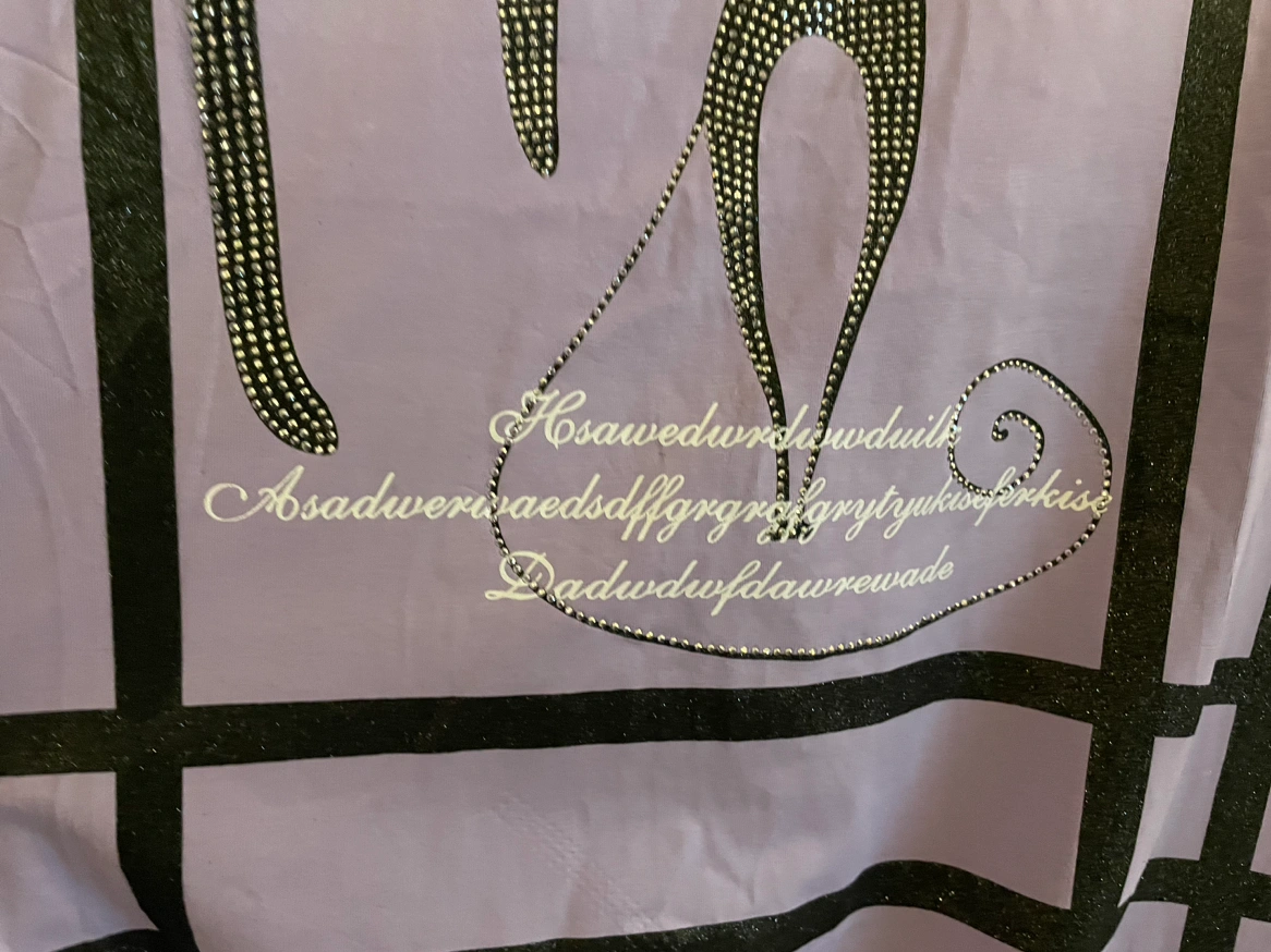 Brand new green T-shirt with text and sparking ornaments, still with original tags, size is large (even though tags say otherwise).