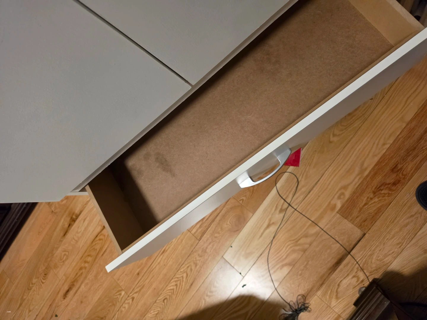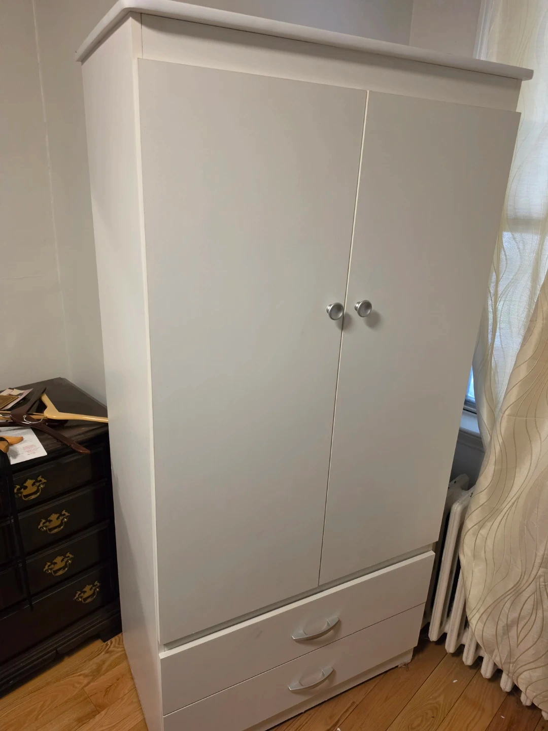 A two-door white wardrobe with a hanging rod and one shelf inside. It also has two drawers at the bottom for extra storage. Perfect for organizing clothes!
