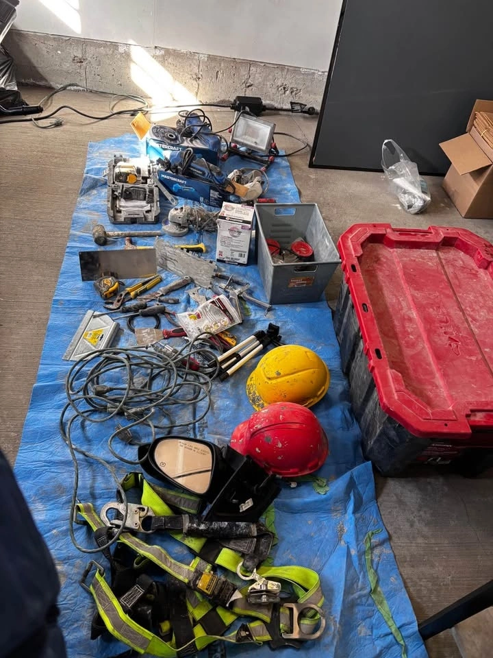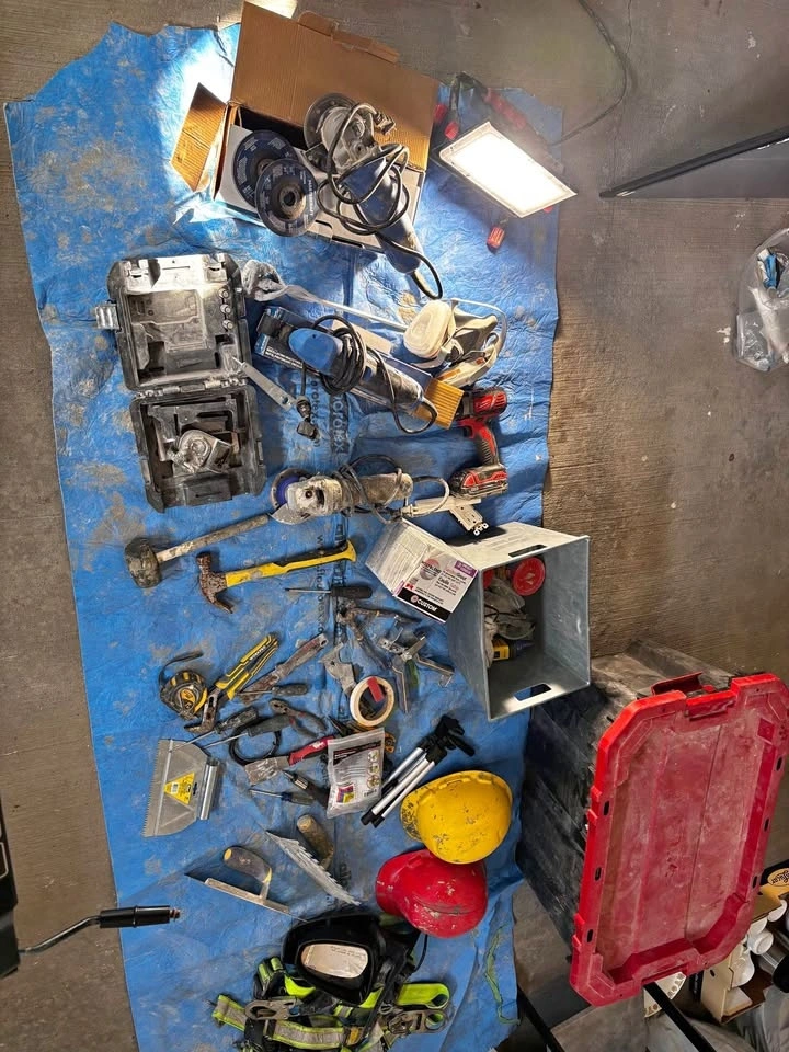 Includes 2 grinders (Bosch and Mastercraft), 1 oscillating multi-tool, heavy-duty work light, Dewalt self-leveling laser, screwdrivers, 2 notched trowels, extension cord, measuring tape, and a large toolbox. All electric tools are in good working condition. Urgent sale!