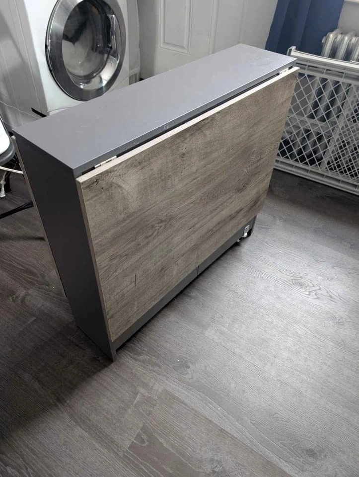 Selling a 4 seat dining table perfect for an apartment, house, or basement. It's still in like new condition and has cabinet space built in. This is a handy table that can conveniently be put away. Height is 2ft 8 inches, 49 inches wide and 31.5 inches across.