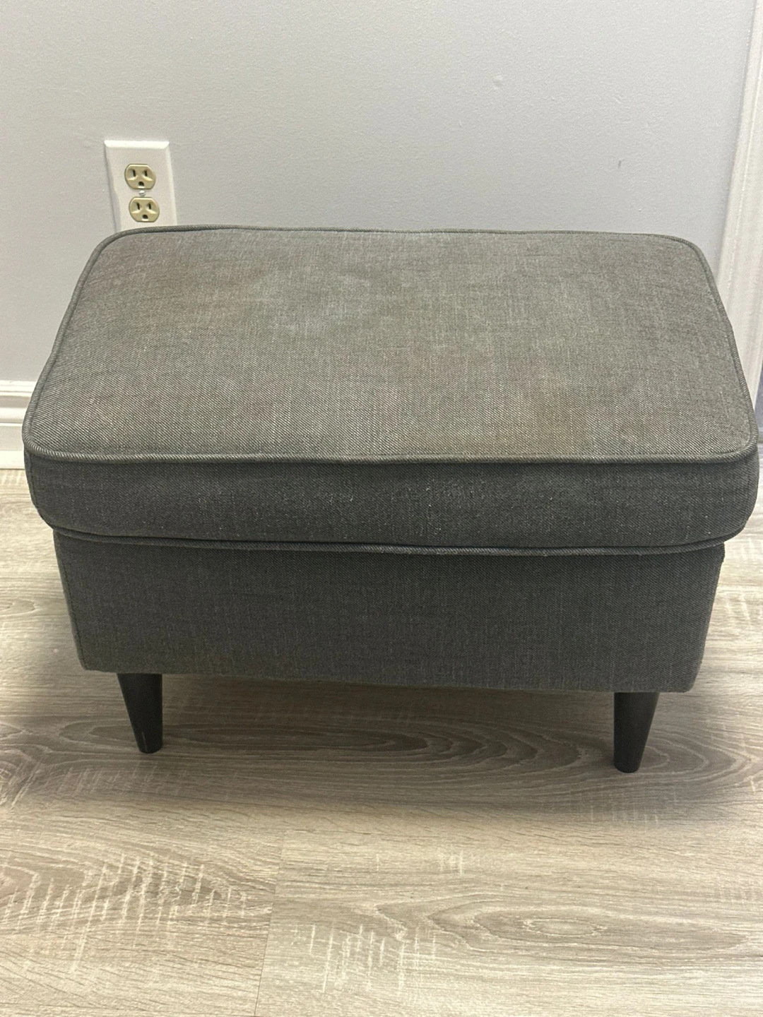 This fabric ottoman is a handy accent piece for any room. It's upholstered in a grey woven fabric with dark tapered legs. Storage is accessible from the top cushion.Pick up @ Long branch, Etobicoke. Call this number 647 949 2962 now