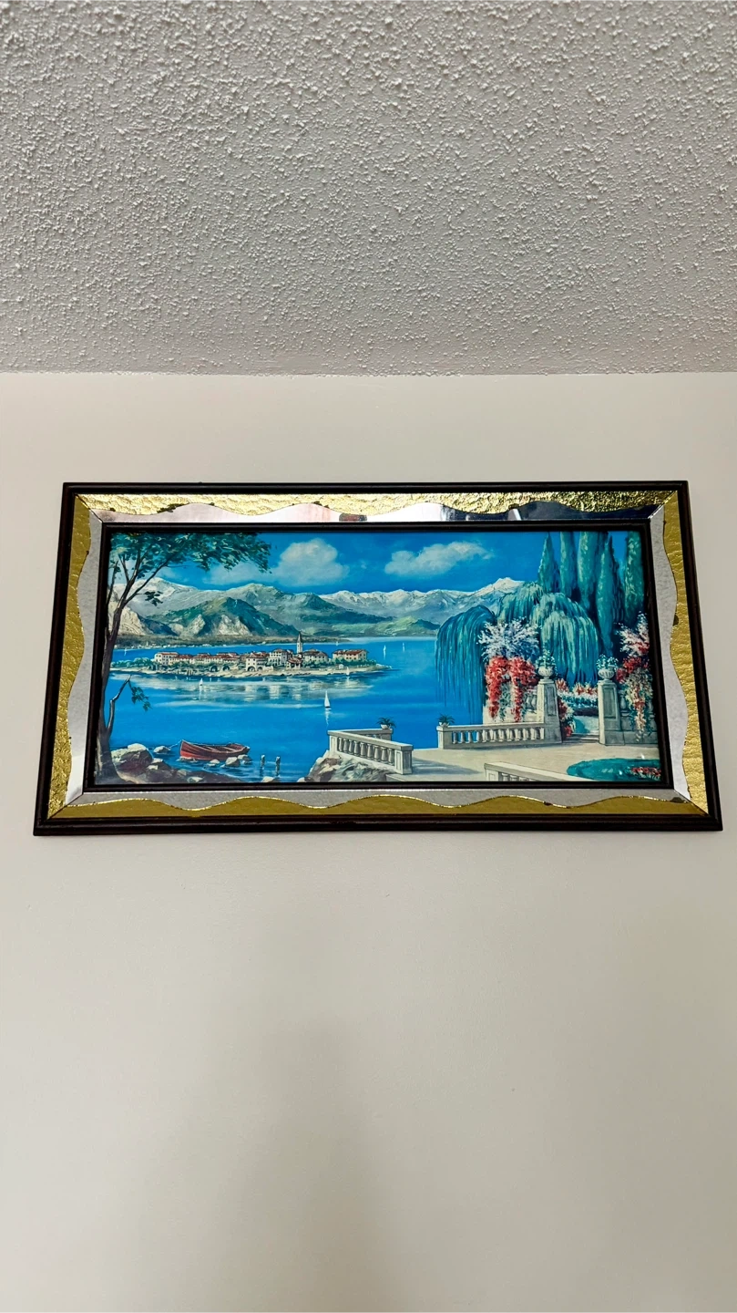 This framed artwork depicts a vibrant lakeside town with mountains in the background. It's framed in a dark wood with a decorative gold and silver trim. Adds a touch of scenic beauty to any room. Smoke free home!