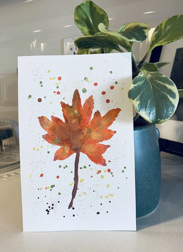 5X7 Watercolor Maple Leaf painted by me. Can be framed or used as a greeting card or a postcard. Buy 5 (5X7) get 1 free. Pick up in Edgemont.