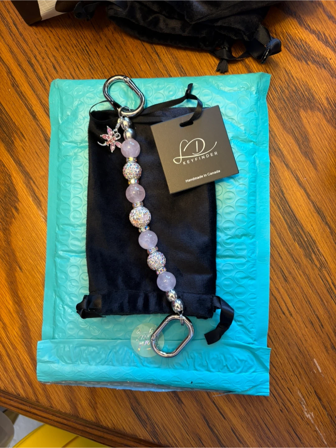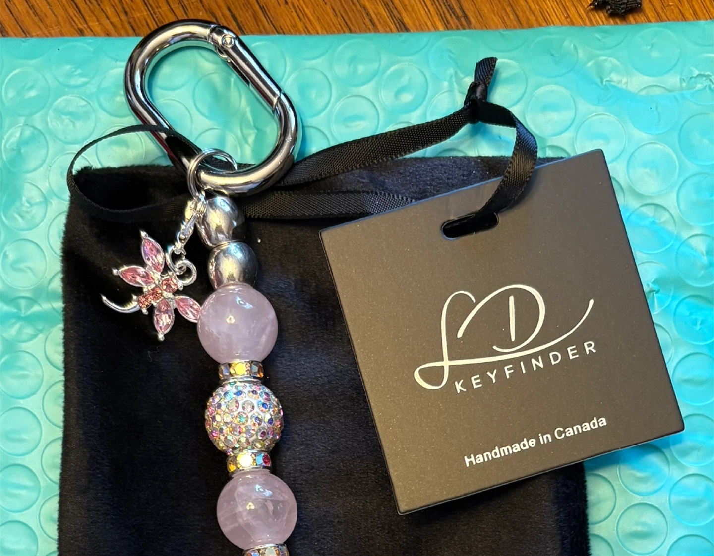 This handmade keychain from Keyfinder features a sparkling dragonfly charm and colourful beads. It's crafted with care in Canada and includes a sturdy carabiner clip. A great way to make your keys easy to spot!