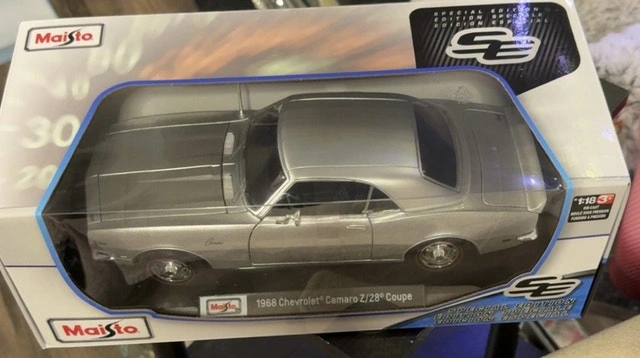 This is a Maisto 1:18 die-cast collectible of a 1968 Chevrolet Camaro Z/28 Coupe Special Edition, still brand new in its original packaging. It's a perfect gift for car enthusiasts or a great addition to any die-cast collection. Brand: Maisto, Scale: 1:18, Model: 1968 Chevrolet Camaro Z/28 Coupe, Special Edition, Condition: New in box. If the ad's still up, this sleek Camaro is still waiting for a new home!