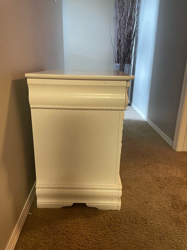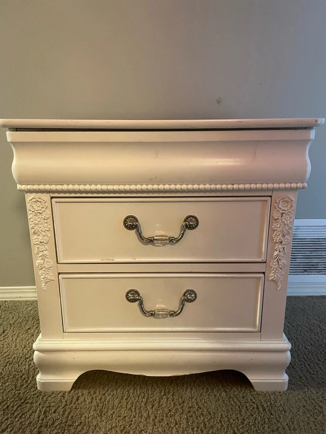 This is a beautiful floral night stand featuring two spacious drawers and a secret compartment, perfect for adding a touch of elegance to your bedroom.