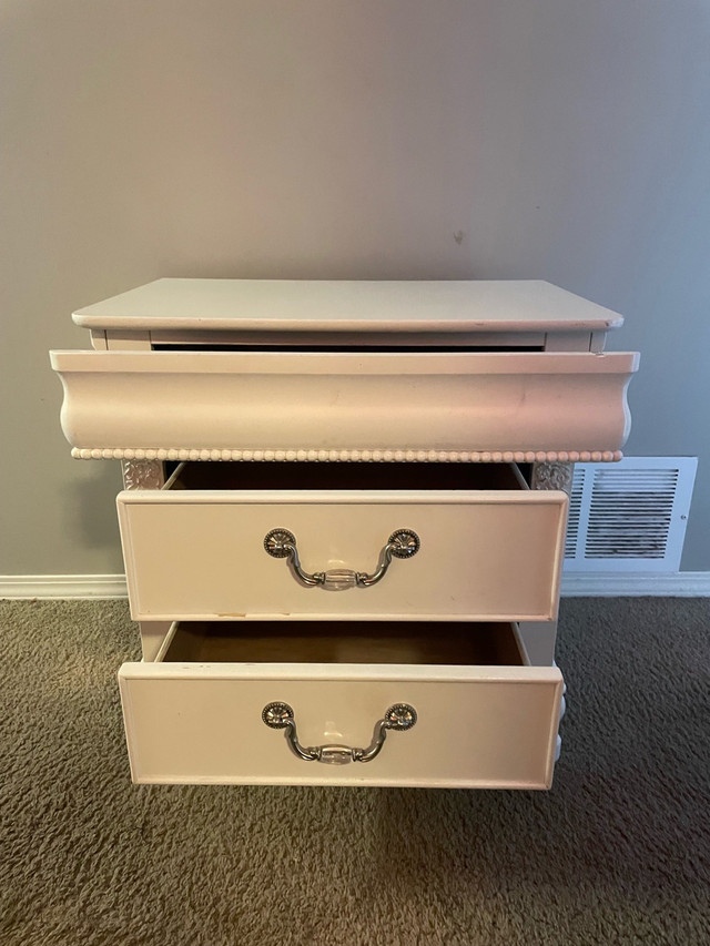 This is a beautiful floral night stand featuring two spacious drawers and a secret compartment, perfect for adding a touch of elegance to your bedroom.