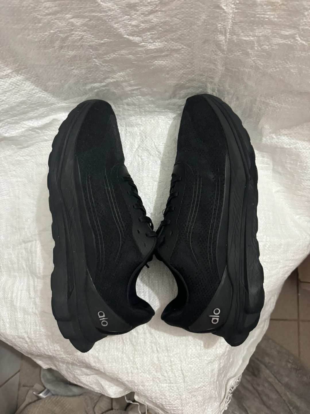 These are black Alo running shoes. They feature a breathable mesh upper and a supportive sole. Good for workouts or casual wear!