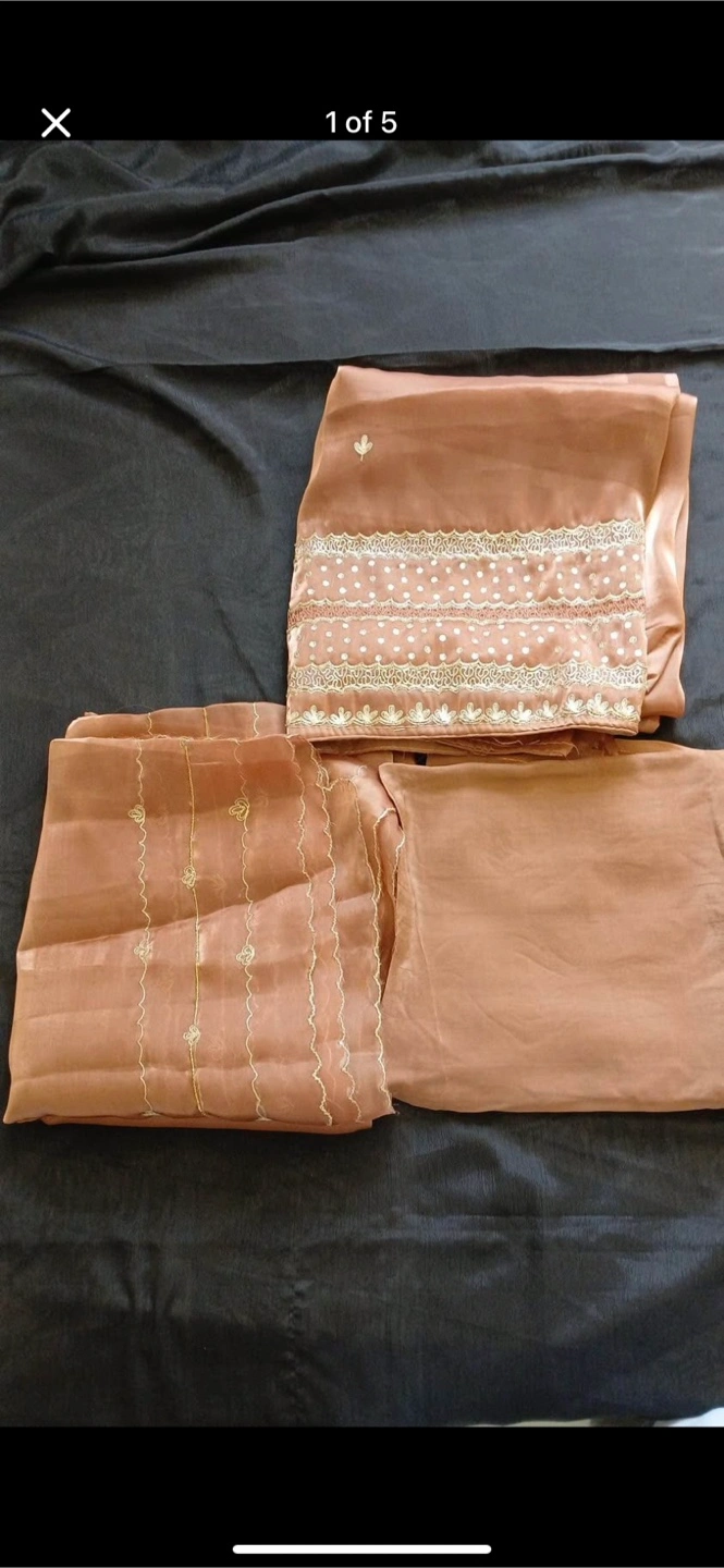 A beautiful brown salwar kameez suit, perfect for any occasion! The material is lightweight and comfortable, and the intricate detailing adds a touch of elegance. It's in great condition and ready for a new home