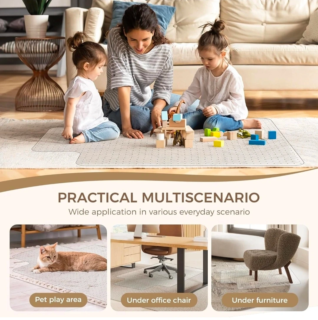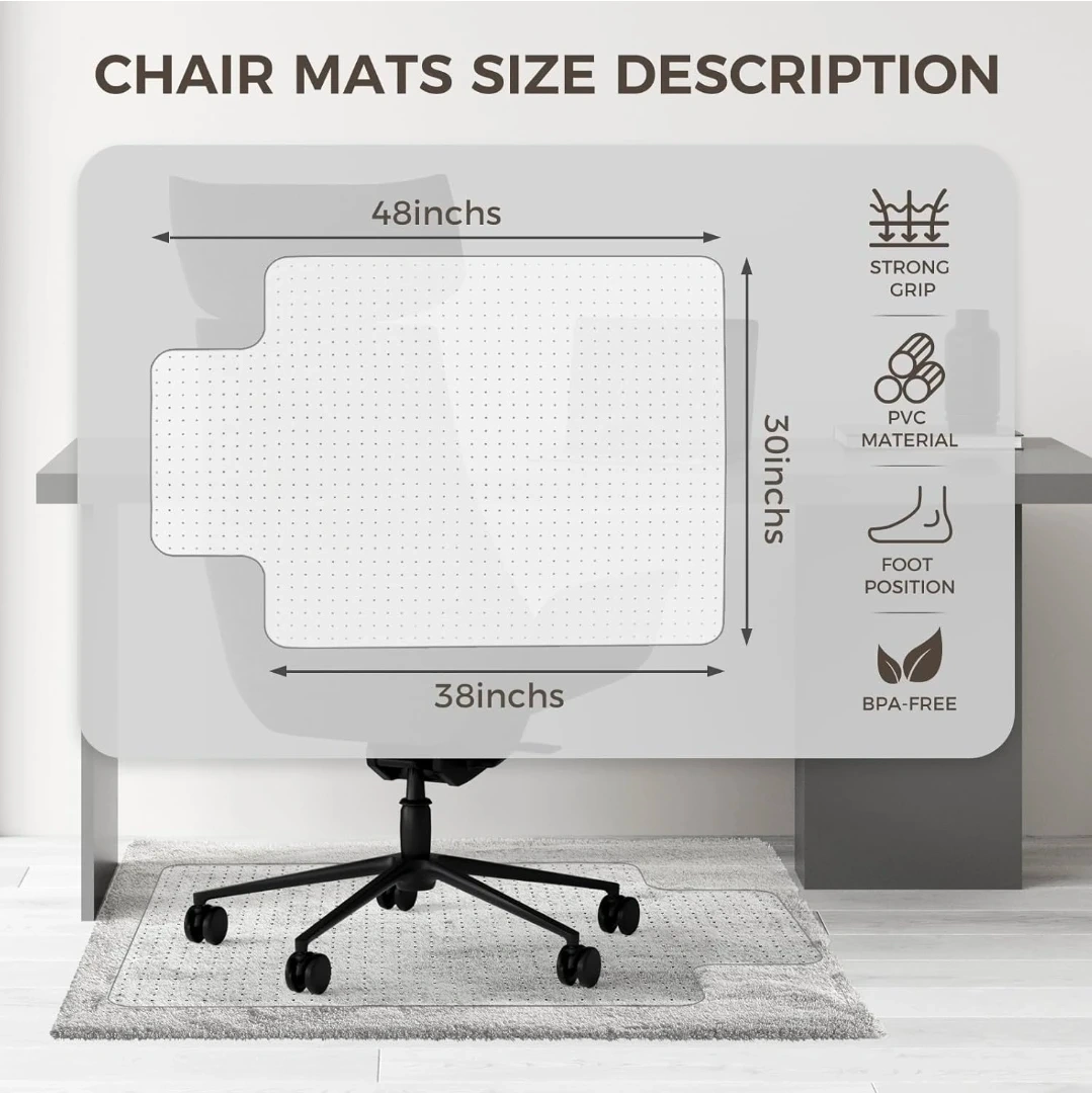 Protect your carpet with this clear PVC chair mat. It features a non-slip studded backing designed to grip carpets. The mat is BPA-free and measures 30 by 48 inches.