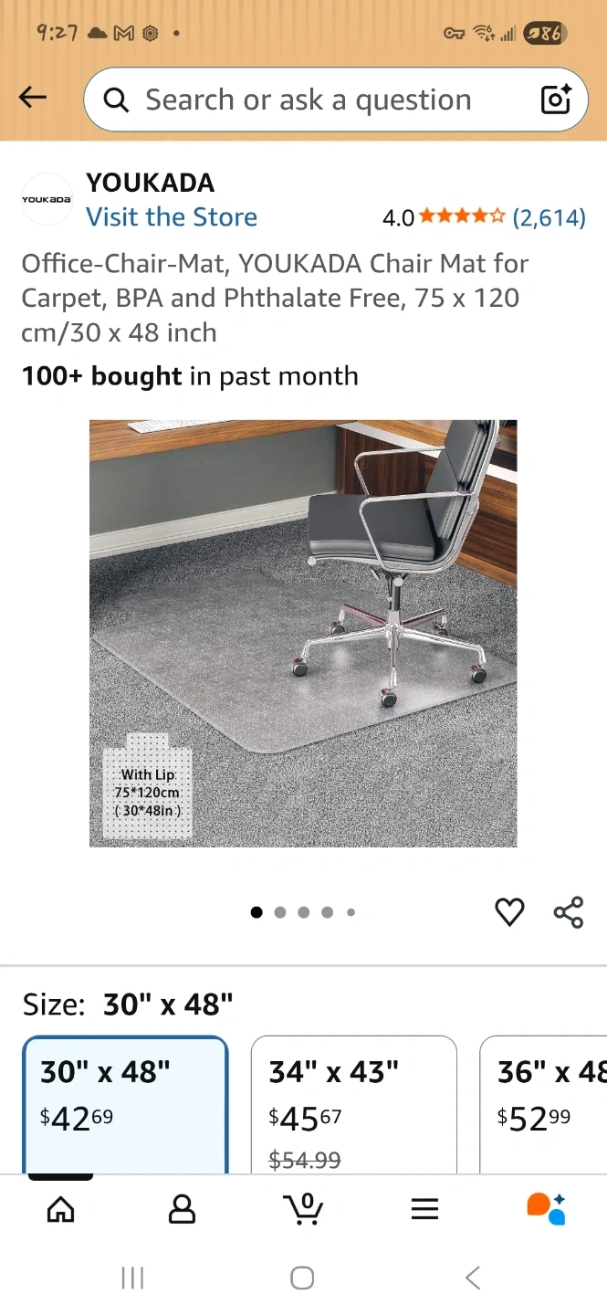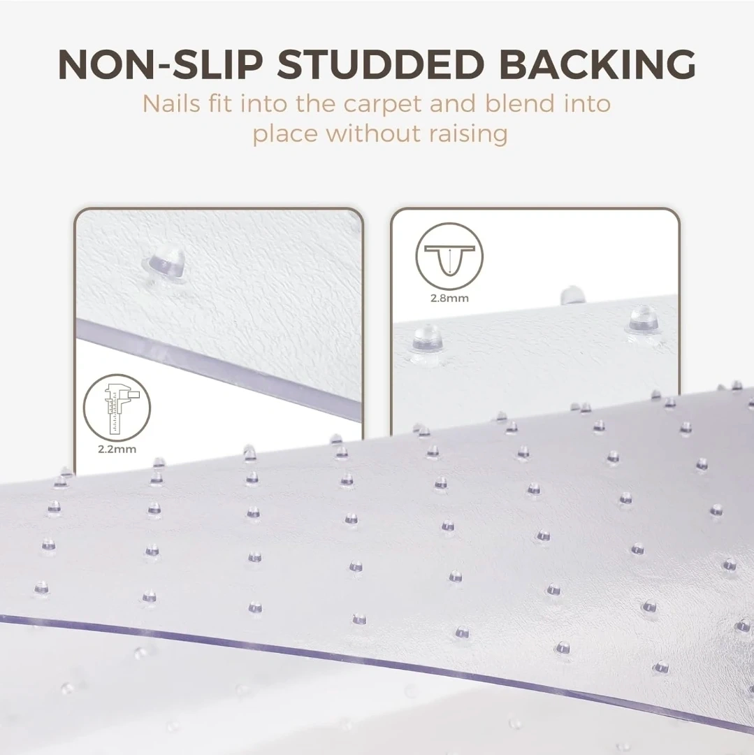 Protect your carpet with this clear PVC chair mat. It features a non-slip studded backing designed to grip carpets. The mat is BPA-free and measures 30 by 48 inches.