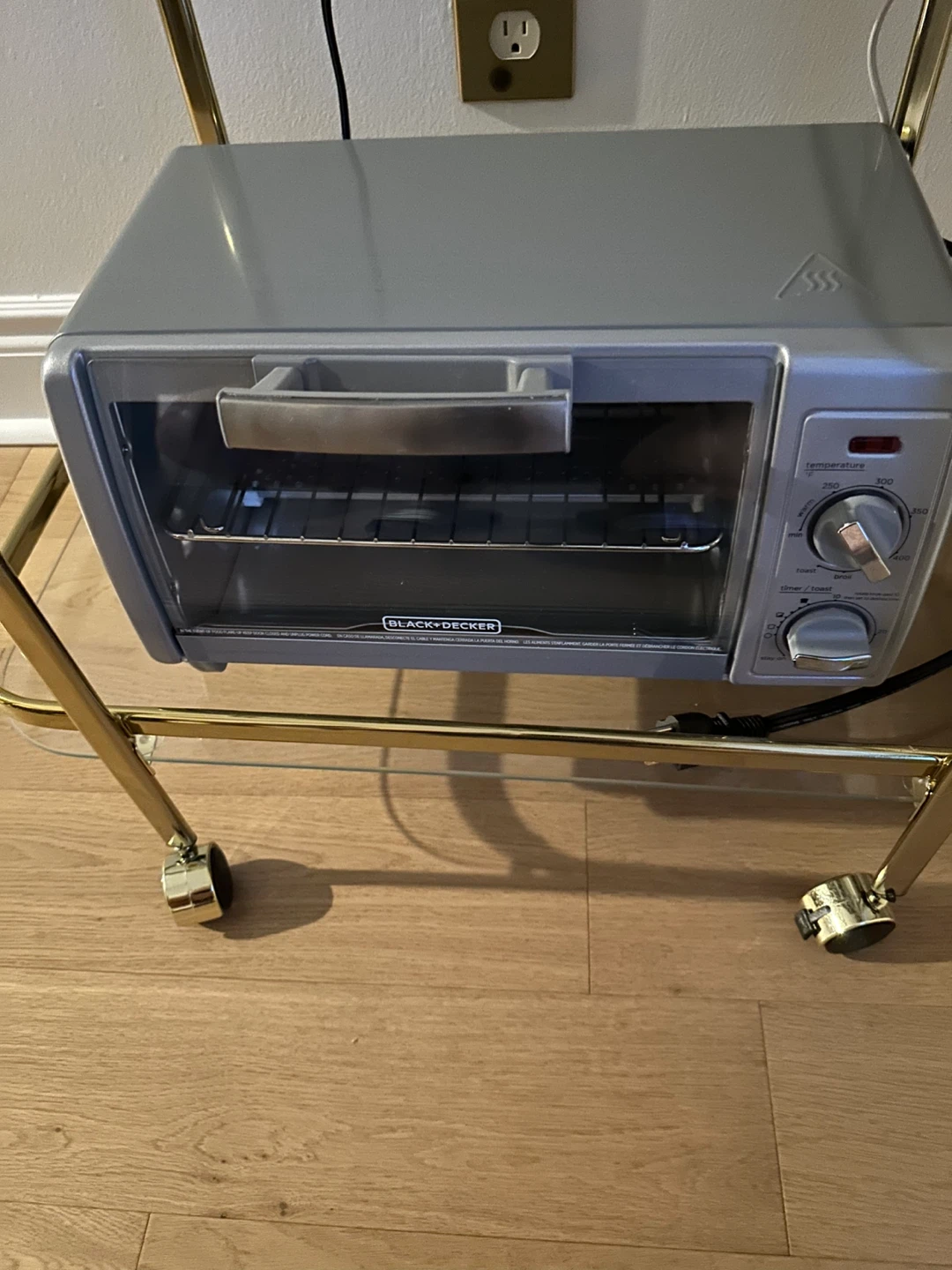 This is a grey Black+Decker 4-slice toaster oven. It has temperature and timer controls. It's handy for toasting and baking small items.